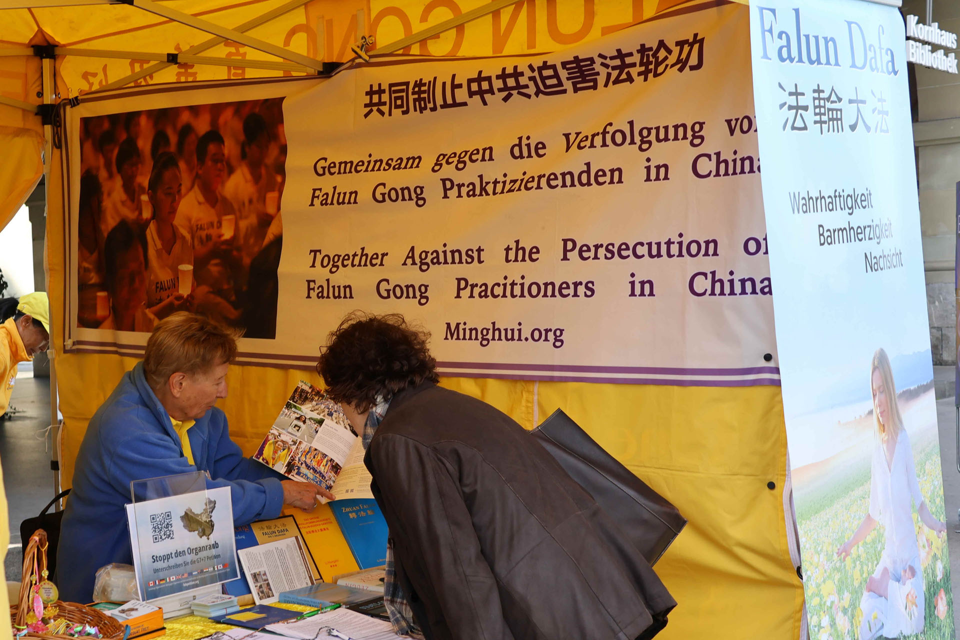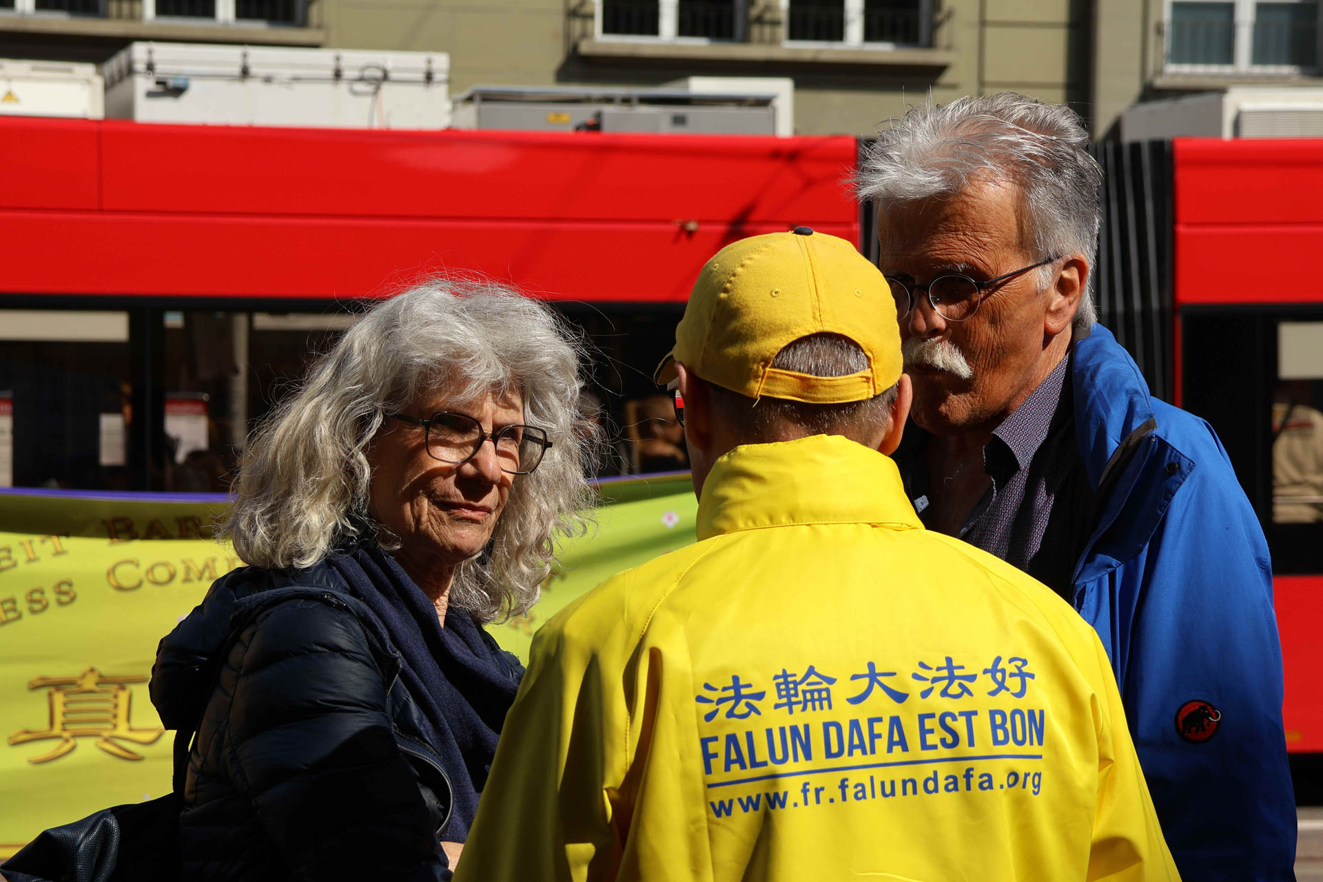 二零二五年四月二十六日下午,法轮功学员再次来到伯尔尼市(Bern)中心,向人们讲述二十六年前让世界惊叹的万人上访的故事,及随后中共的所为。路人有的静静聆听学员们的演讲,有的仔细阅读讲述法轮功故事的真相展板,有的和学员们长时间交谈,了解更多讯息。