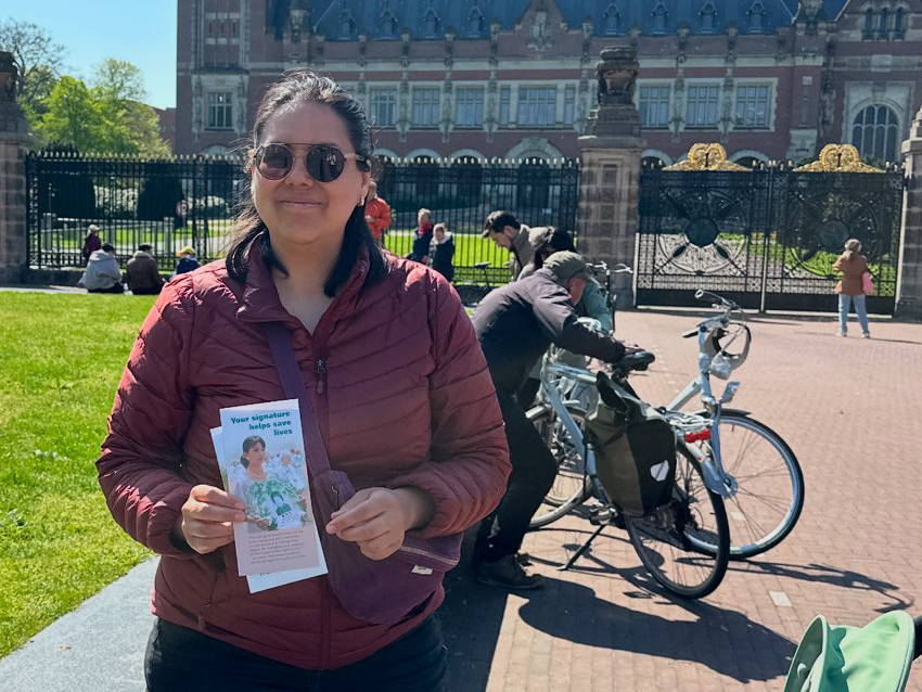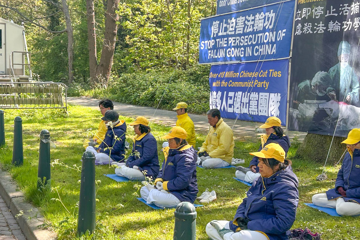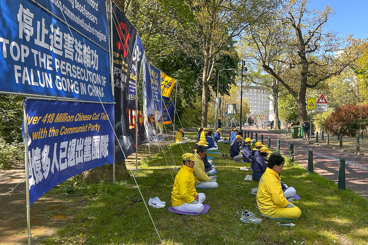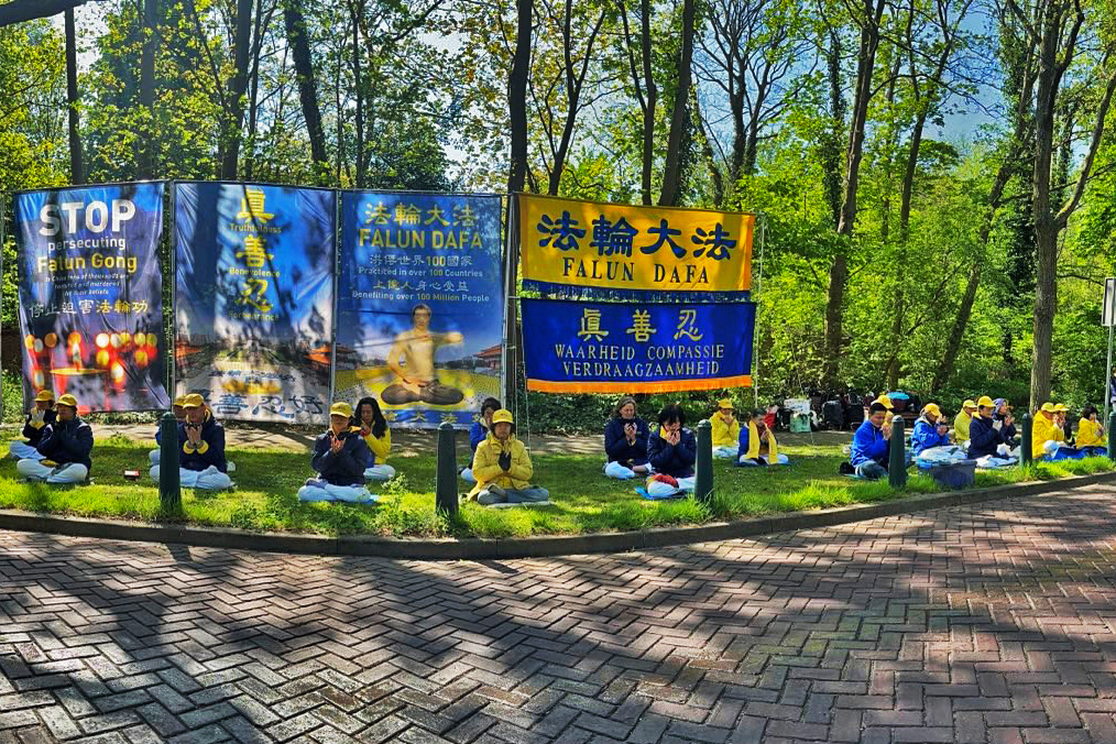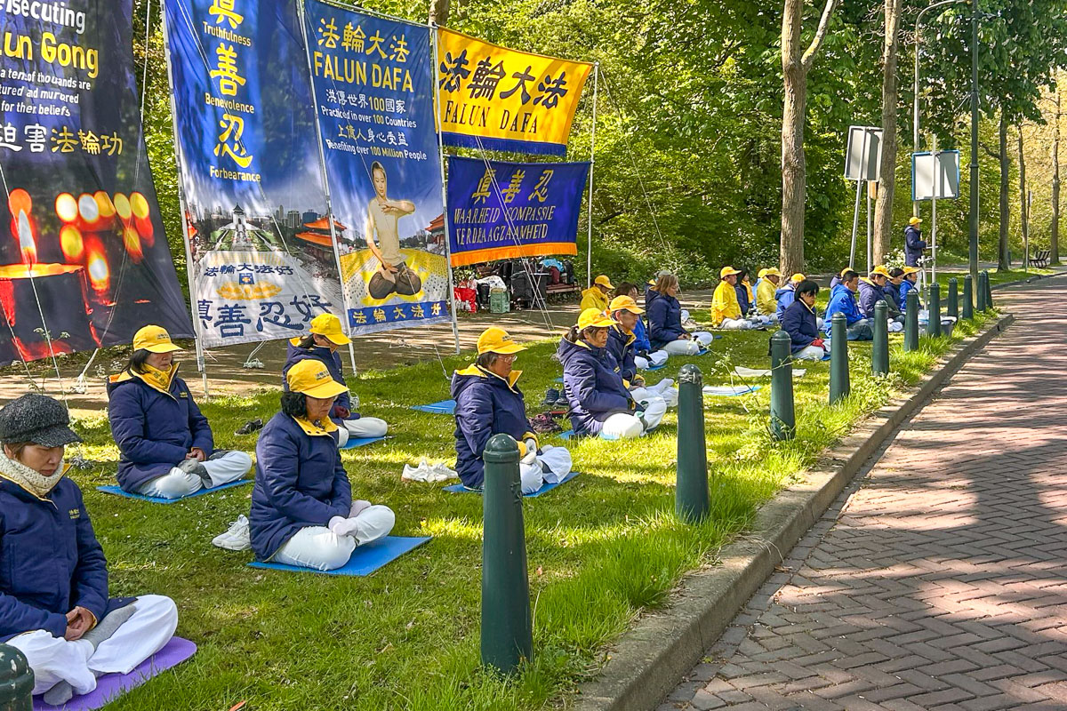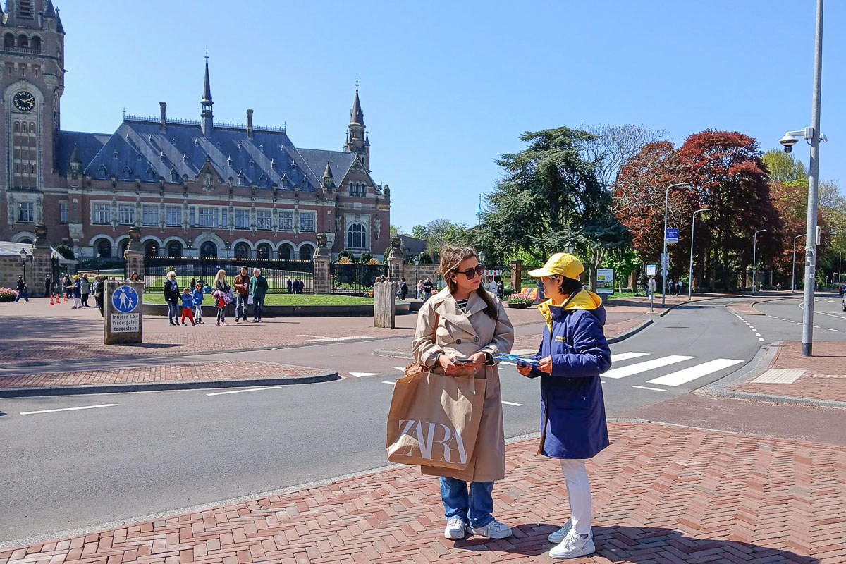 四月二十五日下午,荷兰法轮功学员分别在海牙市中心大市场街(Grote Marktstraat)和海牙和平宫景点设立展板和横幅,现场展示法轮功功法,有的学员以征签的方式对民众讲述真相。
