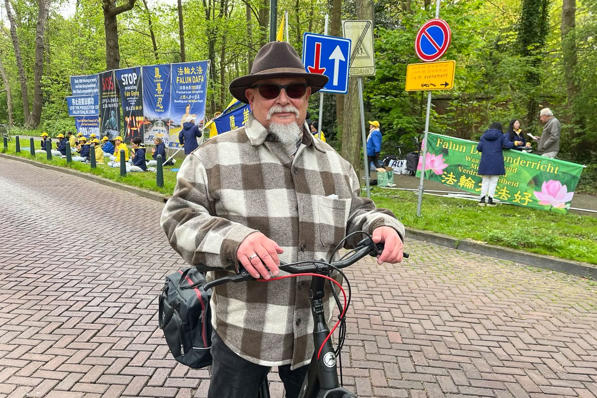 汉斯‧斯瓦普(Hans Swaep)先生是海牙艺术画廊老板,他经过法轮功学员集会现场时被平和的打坐场面吸引。