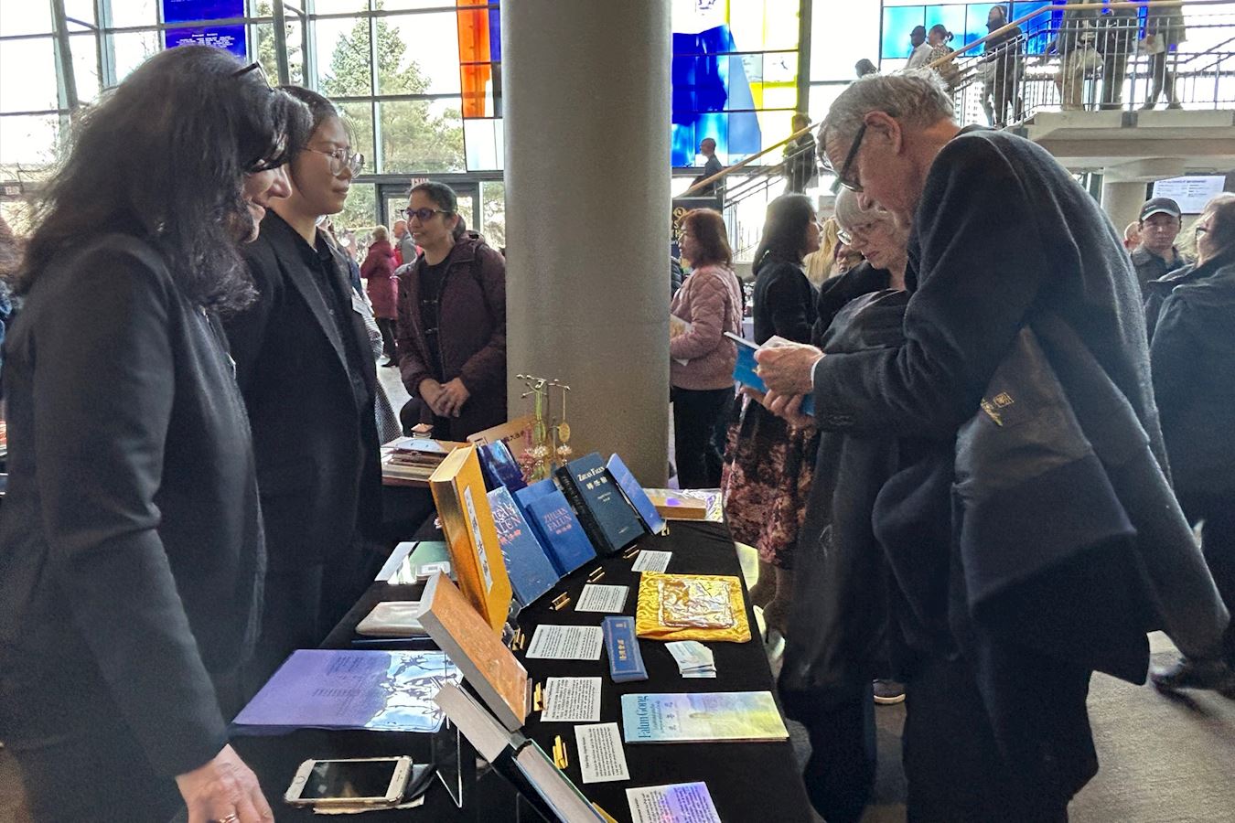 ![]() 图6:二零二五年三月二十六日晚,美国一家公司的财务总监达伦·史密斯(Darren Smith) 和太太观赏了在夏安市的神韵演出。中场休息期间,他们在法轮大法书籍的展位前排队准备购买。(大纪元) |