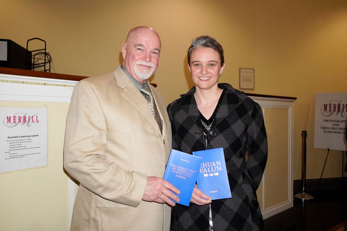 ![]() 图4:二零二五年四月一日,美国一家网站设计公司的创始人兼执行长乔治娅·克恩(Georgia King)和先生、退役空军上尉克利夫·克恩(Cliff King)在缅因州波特兰欣赏了神韵演出后,对法轮大法非常感兴趣,立即购买了法轮大法的相关书籍。(大纪元) |