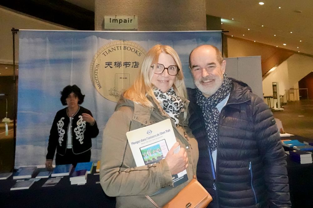 ![]() 图7:二零二五年二月十八日晚,市府绿化部的前主任伊夫·盖特(Yves Gaté)与太太安妮·盖特(Annie Gaté)在法国南特市观赏了神韵演出后,在法国天梯书店的展位上购买了法轮大法书籍。(大纪元) |