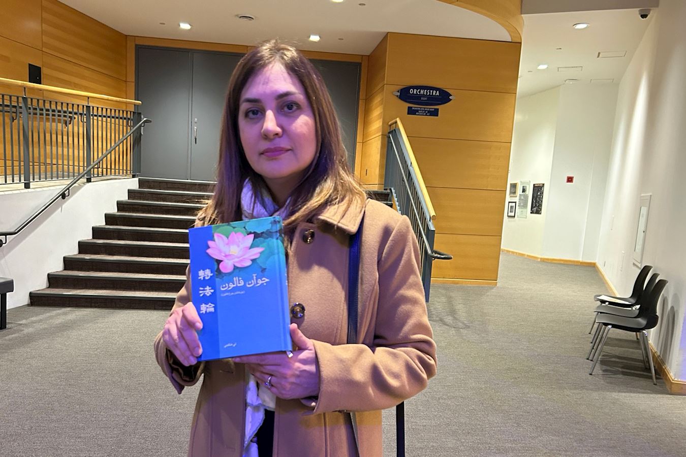![]() 图11:二零二五年三月二十二日晚,加拿大约克大学兽医博士后研究员米娜(Mina H),观赏了神韵在加拿大密西沙加市的演出,现场购买了一本《转法轮》。(大纪元) |