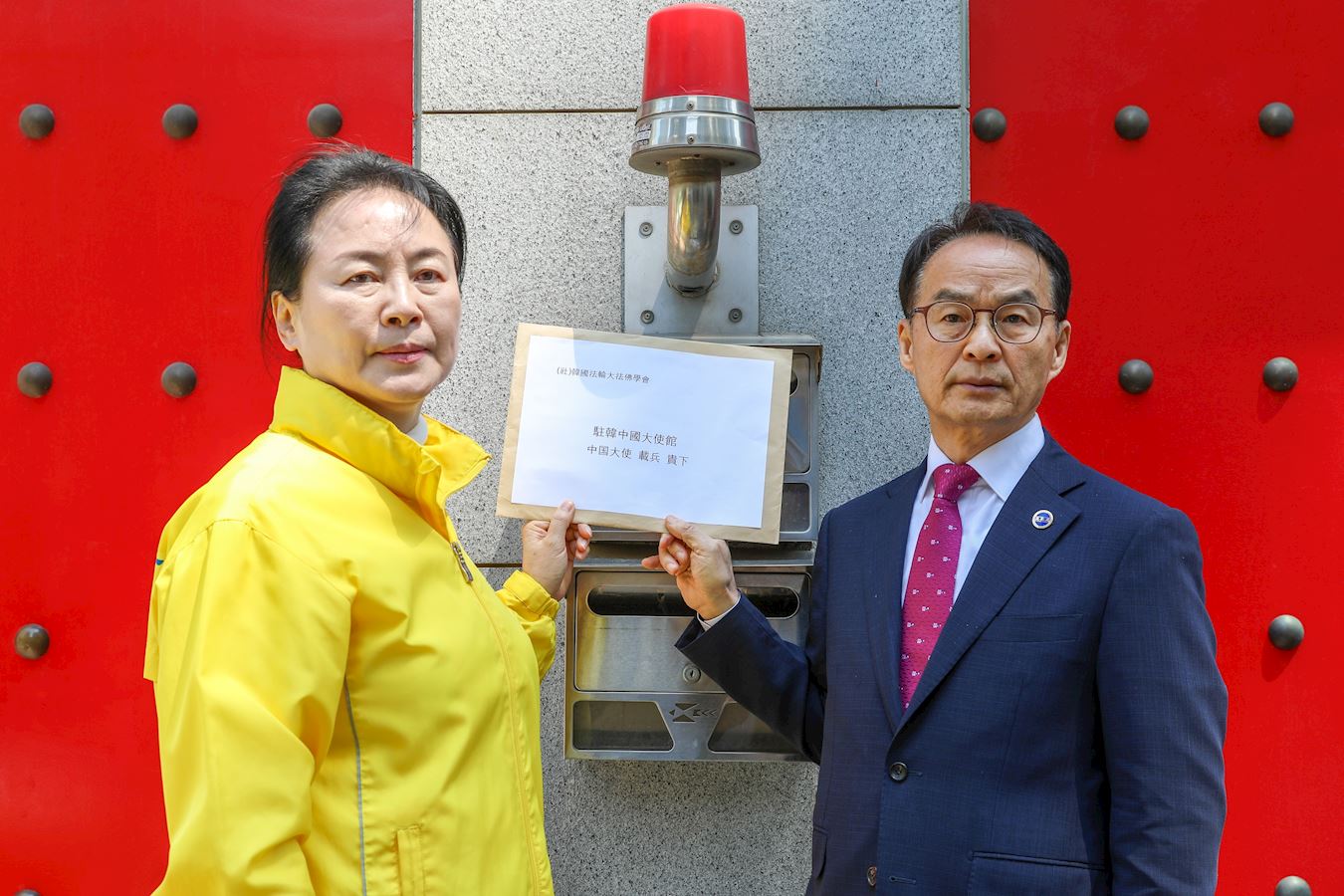 ![]() 图5:韩国法轮大法佛学会把佛学会声明书投递到驻韩中国大使馆。 |
