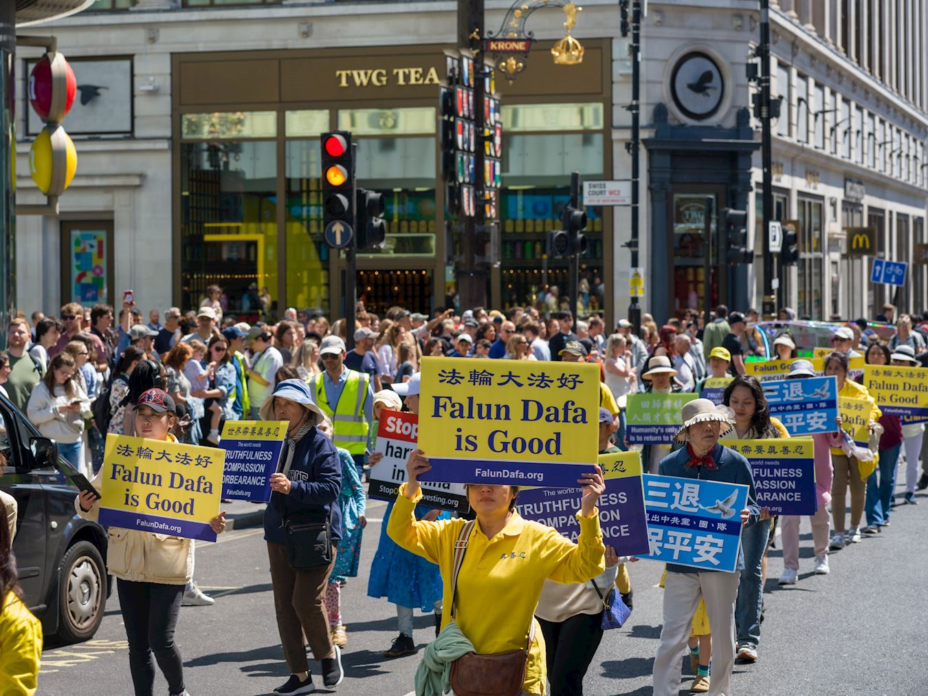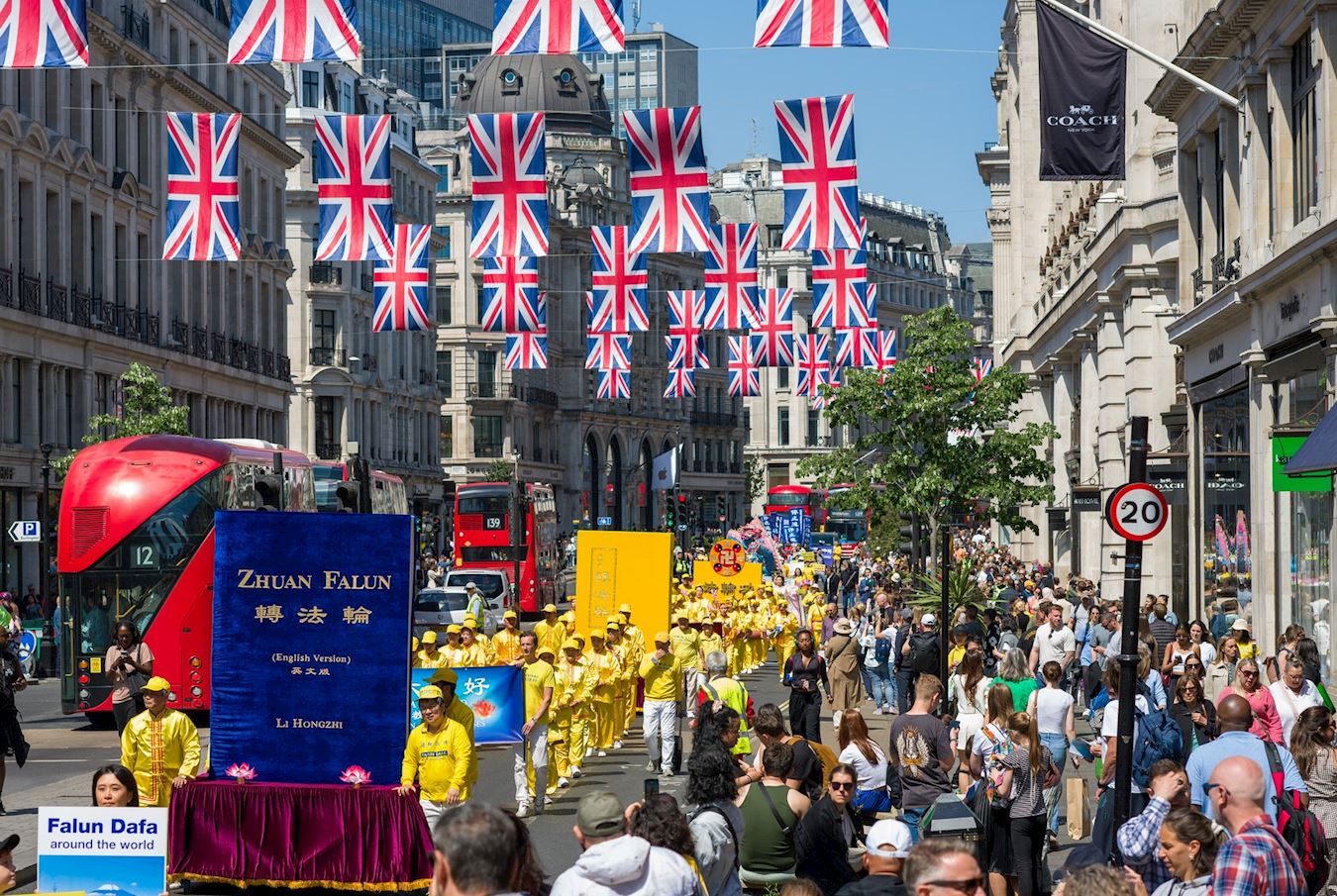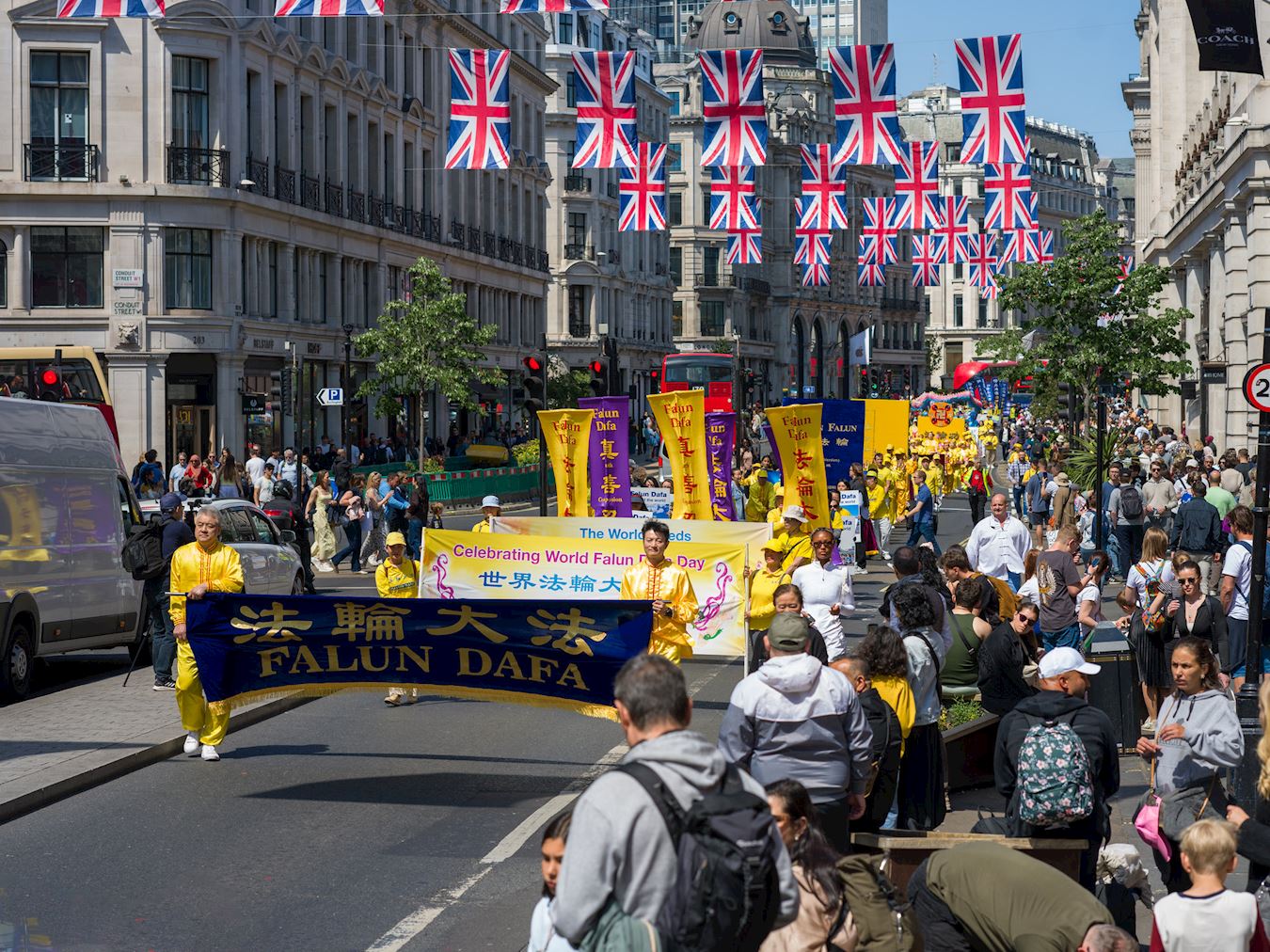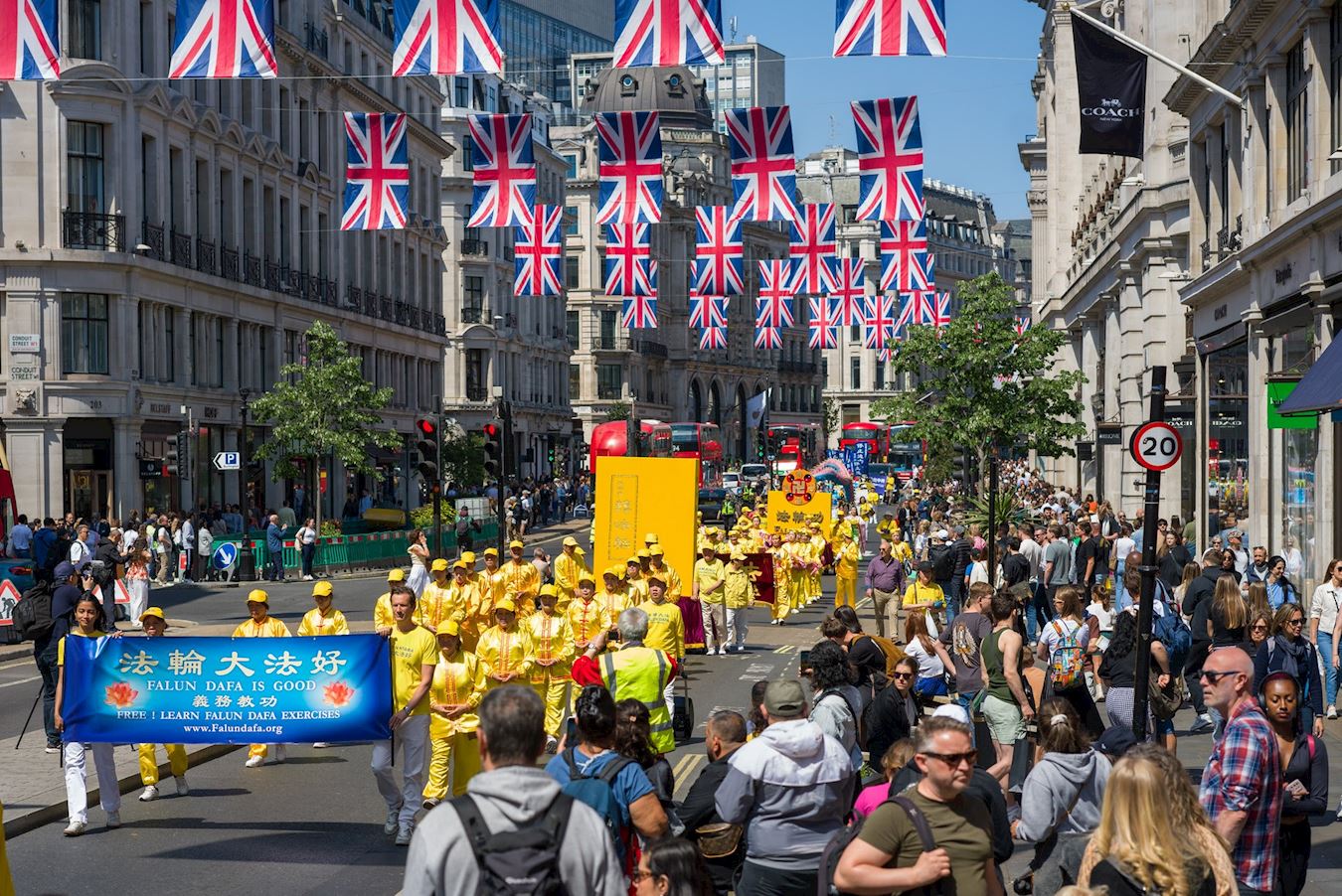 ![]() 图2~9:二零二五年五月十日,英国法轮功学员在伦敦市中心举行盛大游行,游行队伍经过伦敦市中心。 |