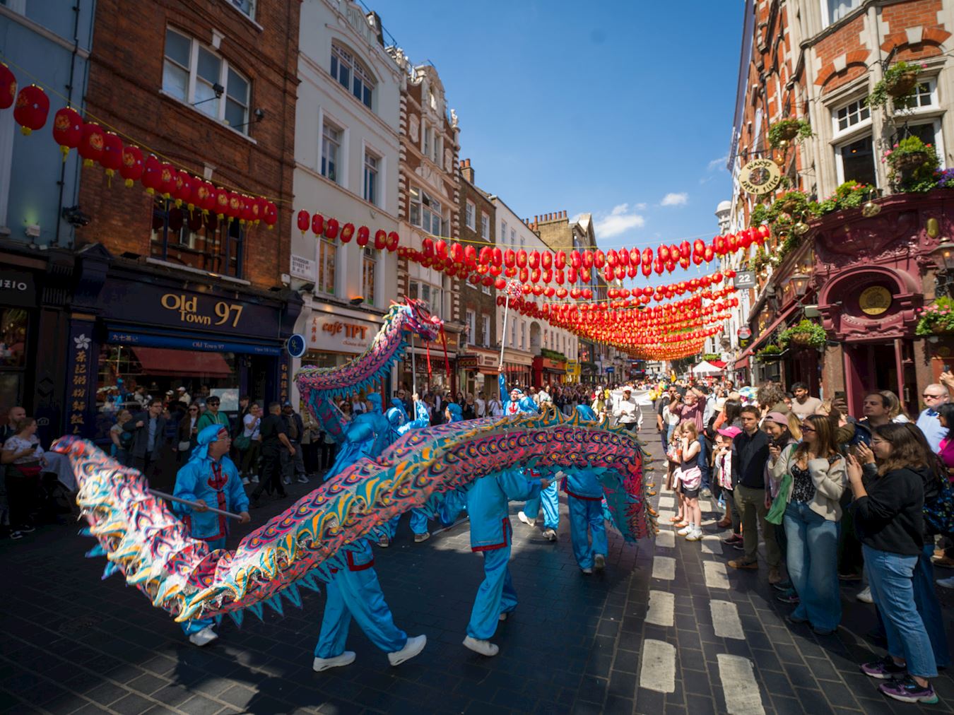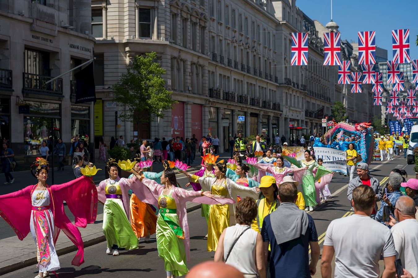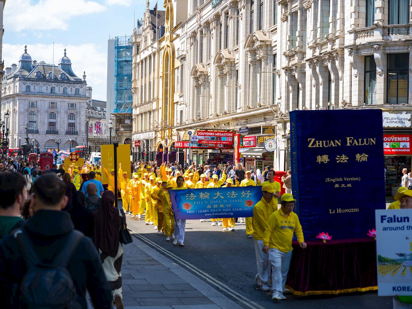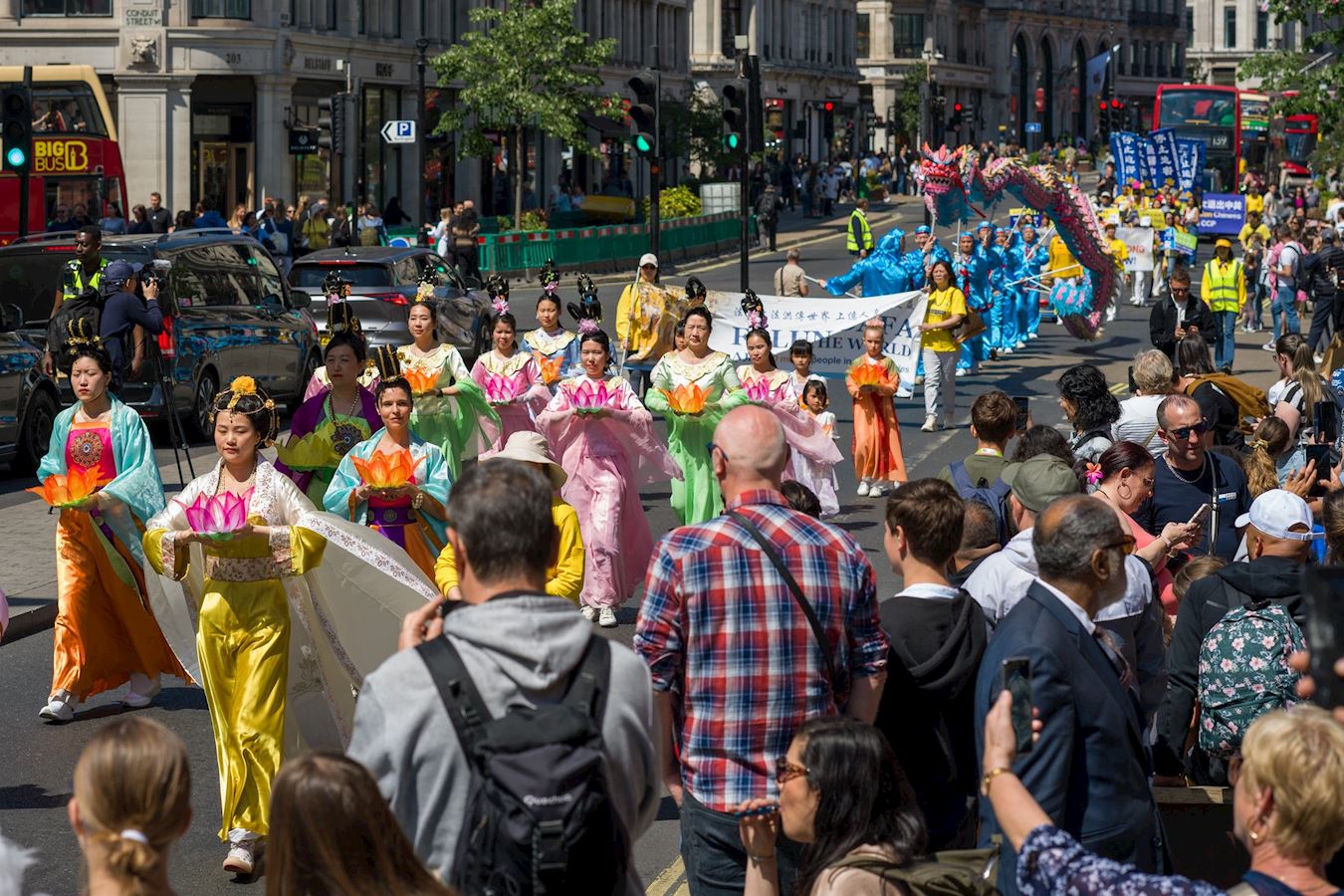 这一天,伦敦阳光明媚,微风和煦,难得的好天气也为盛大的游行增添了节日的喜庆气氛。游行队伍气势恢宏,由腰鼓队、仙女队、舞龙队、功法展示等多个方阵组成,从中国大使馆前启程,途经摄政街、牛津街十字路口、皮卡迪利广场等伦敦市中心最繁华的商业街区和唐人街,一路彩旗飘扬、鼓乐阵阵,场面热烈而祥和。法轮大法的美好,吸引了沿途大量市民和游客驻足观看、拍照录像。