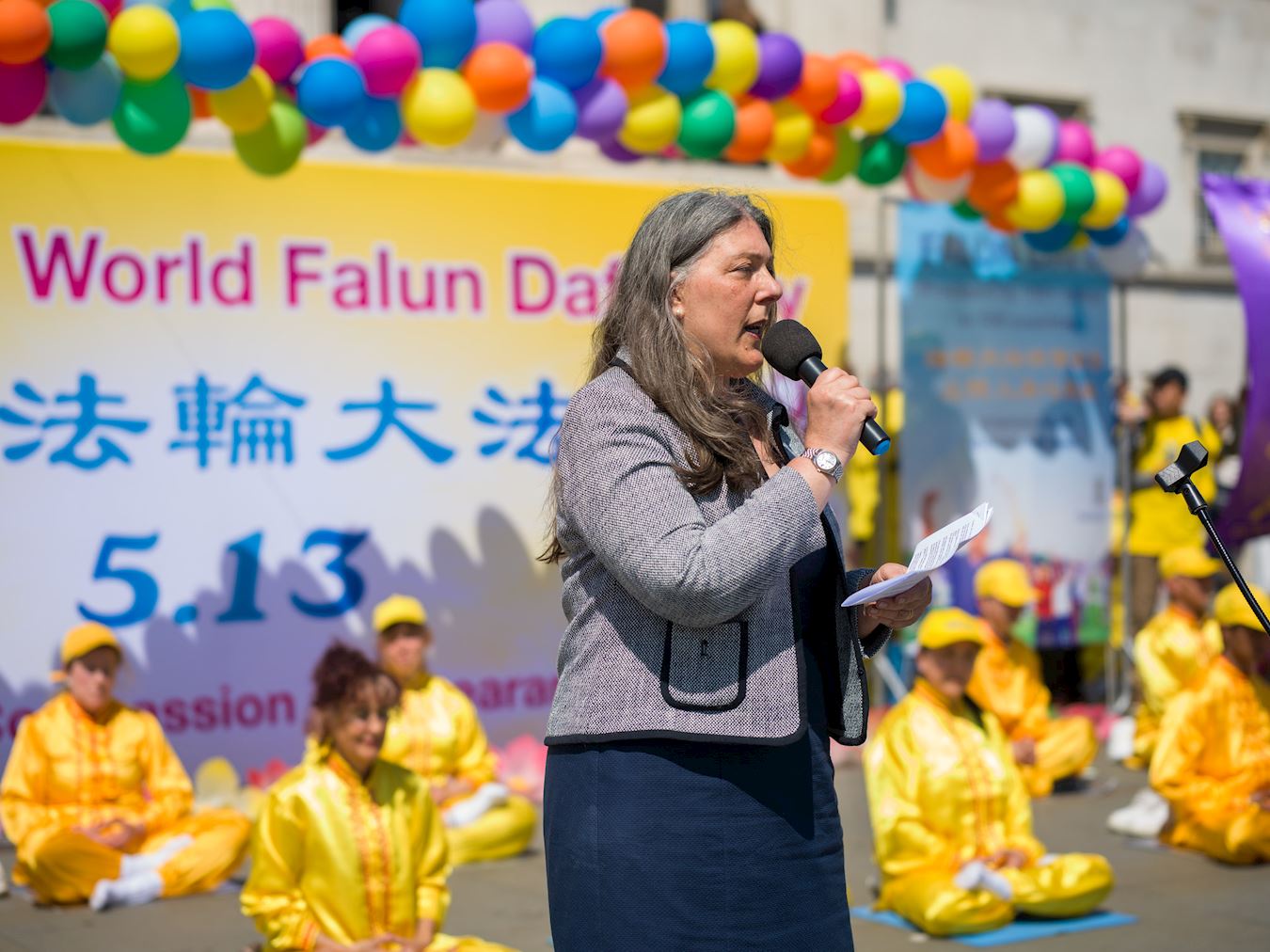 英国法轮大法佛学会代表卡罗琳在发言中说:“在全球一百多个国家,人们正在做一件真正非凡的事情——共同庆祝法轮大法日。”