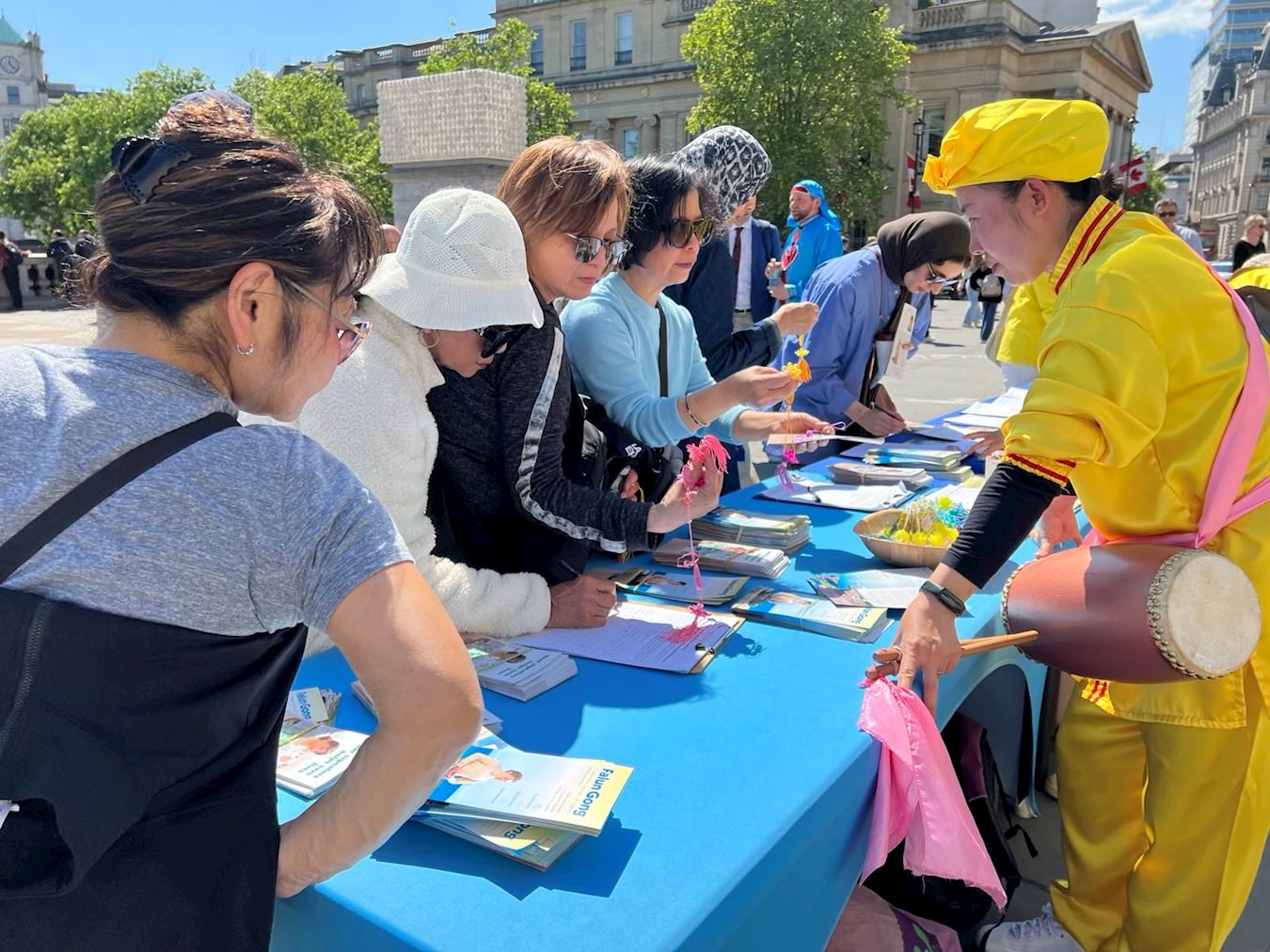 游行沿途,并在整个活动中,很多民众驻足观看、拍照、接受传单,并表达对法轮功学员的支持。
