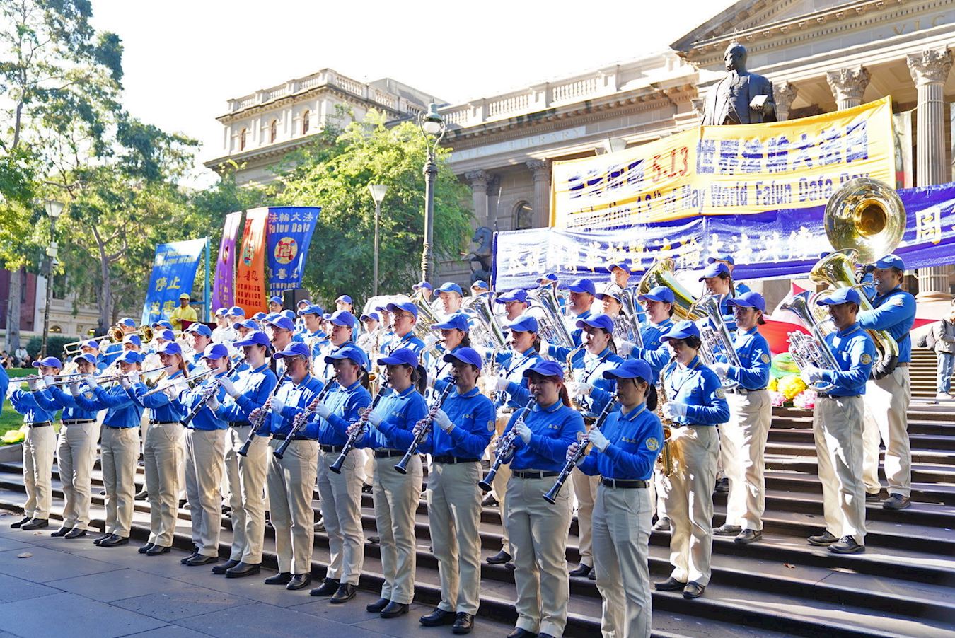 '图13~16:二零二五年五月十日下午,澳洲墨尔本部份法轮功学员在市中心州立图书馆前集会,庆祝“5‧13世界法轮大法日”,恭贺李洪志师父华诞。'