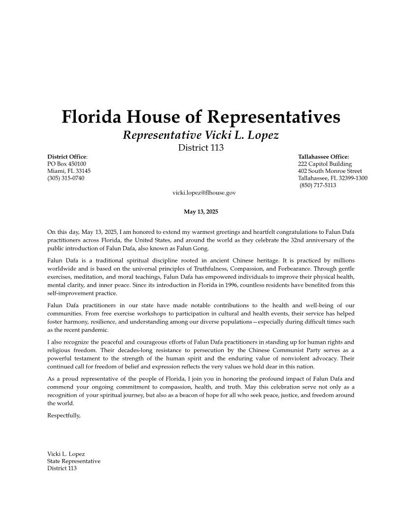 “与大家一同纪念这个重要的日子,也是我们要再一次告诉世界。法轮功修炼群体对人类良知的坚守,在最黑暗的时候,不屈不挠地守护住了光明。”她说,“在中共政权的打压下,法轮功没有消失,而是开始了人类历史上最坚韧、最有道德感召力、最和平的讲真相、反迫害、争取信仰自由运动。”