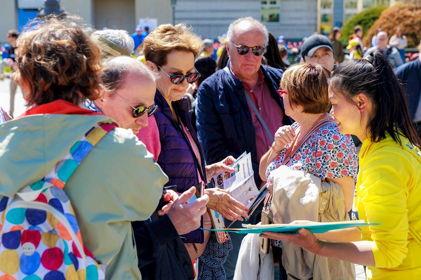 很多人在游行队伍经过时都接过了真相资料,并打算去了解更多讯息,也有人已经决定要学炼法轮大法。