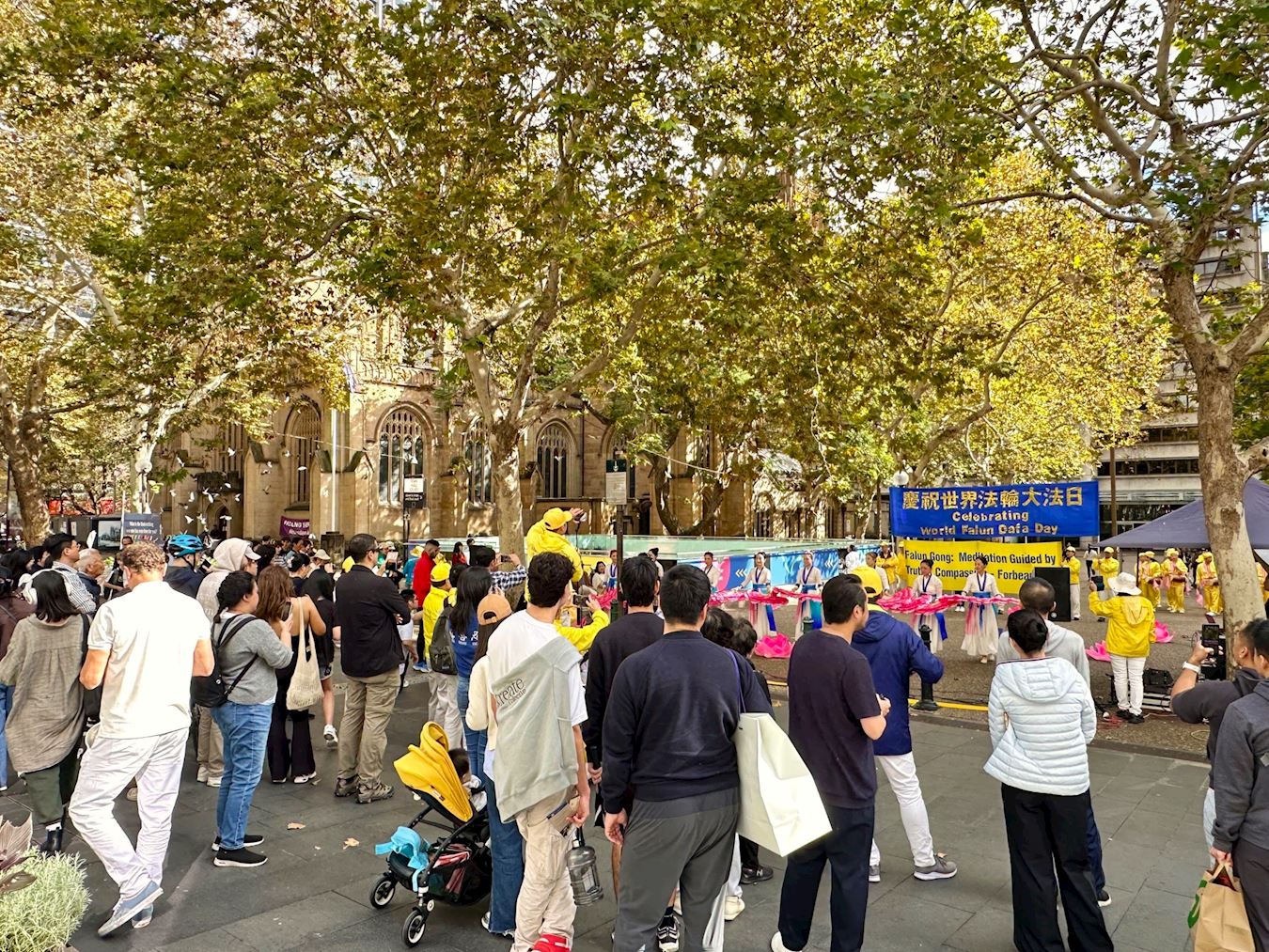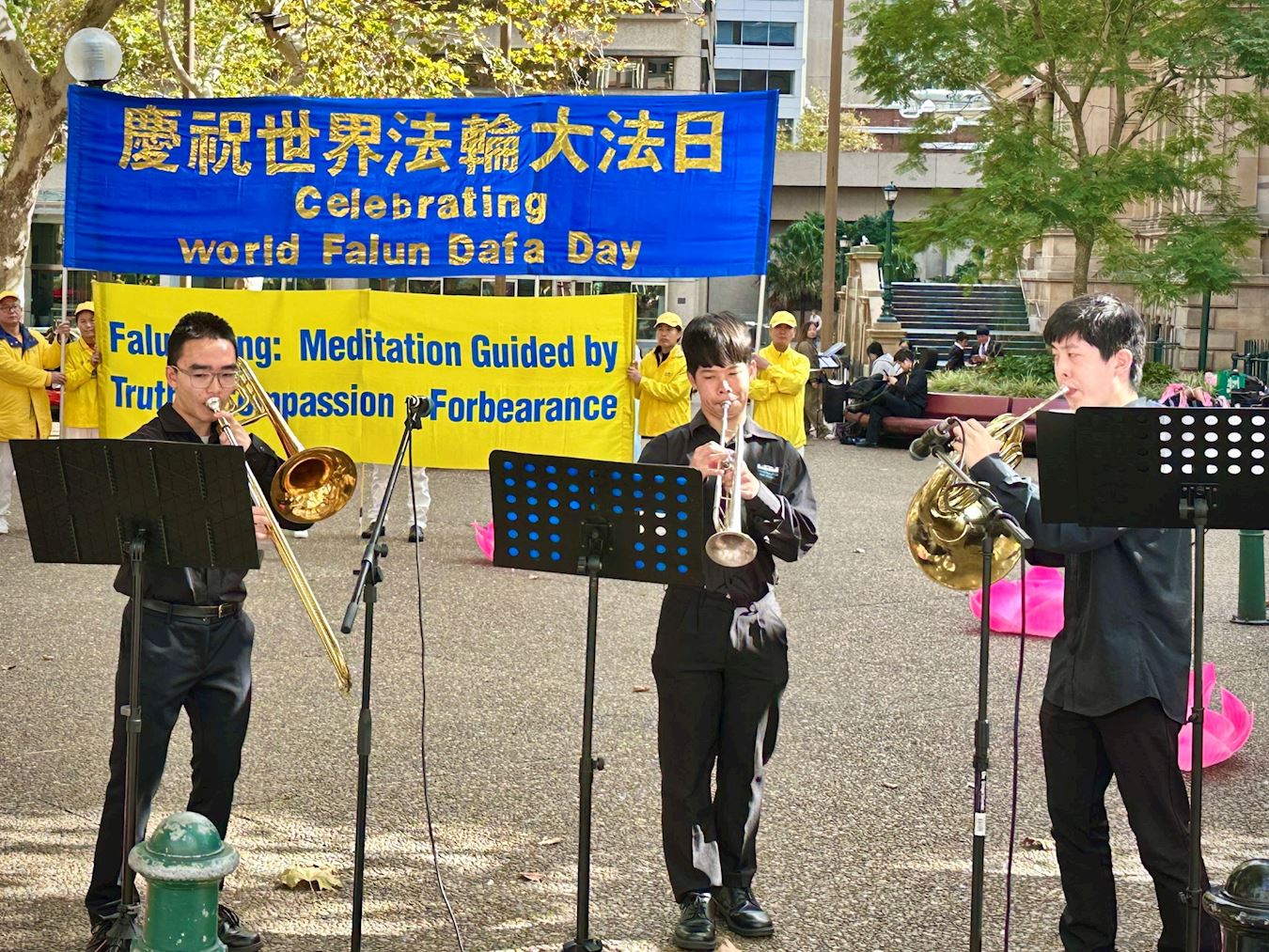 ![]() 图1:法轮功学员与悉尼各界人士在悉尼市政厅前举行集会和文艺表演,欢庆法轮大法日。 |