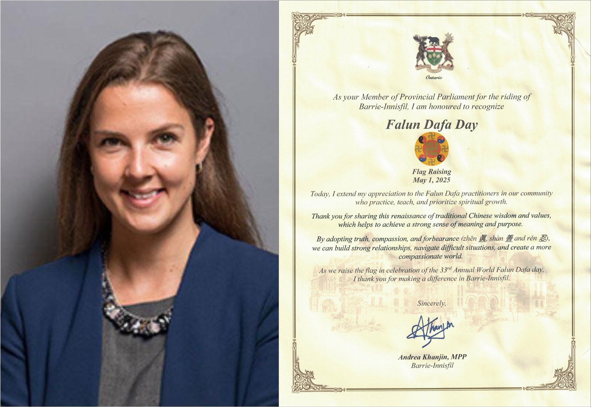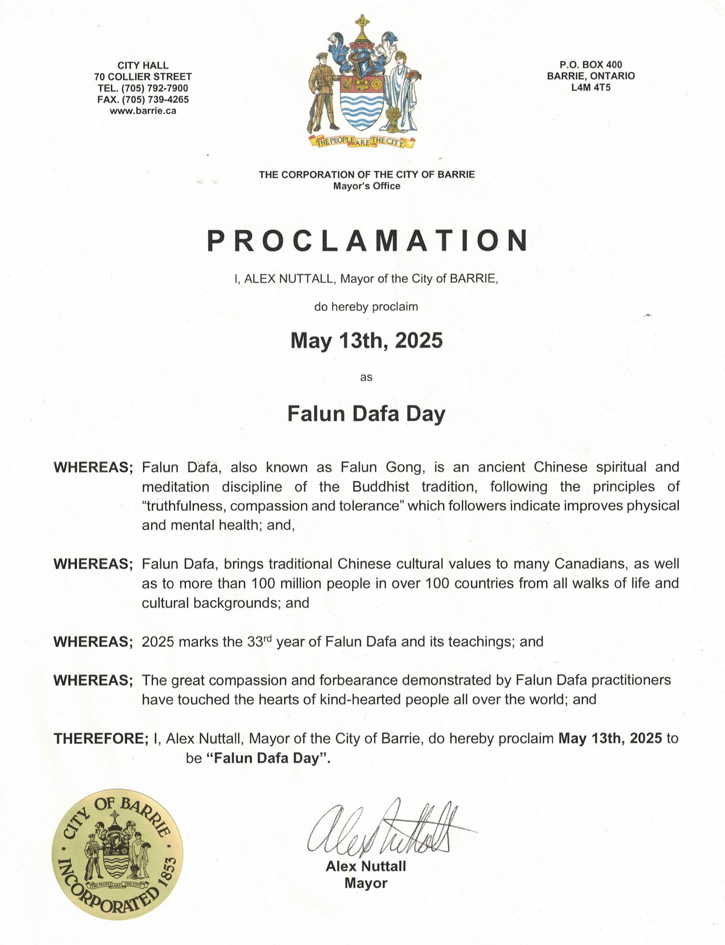 因此:我,亚历克斯·纳特尔,巴里市市长,特此宣布二零二五年五月十三日为(我市的)“法轮大法日”。