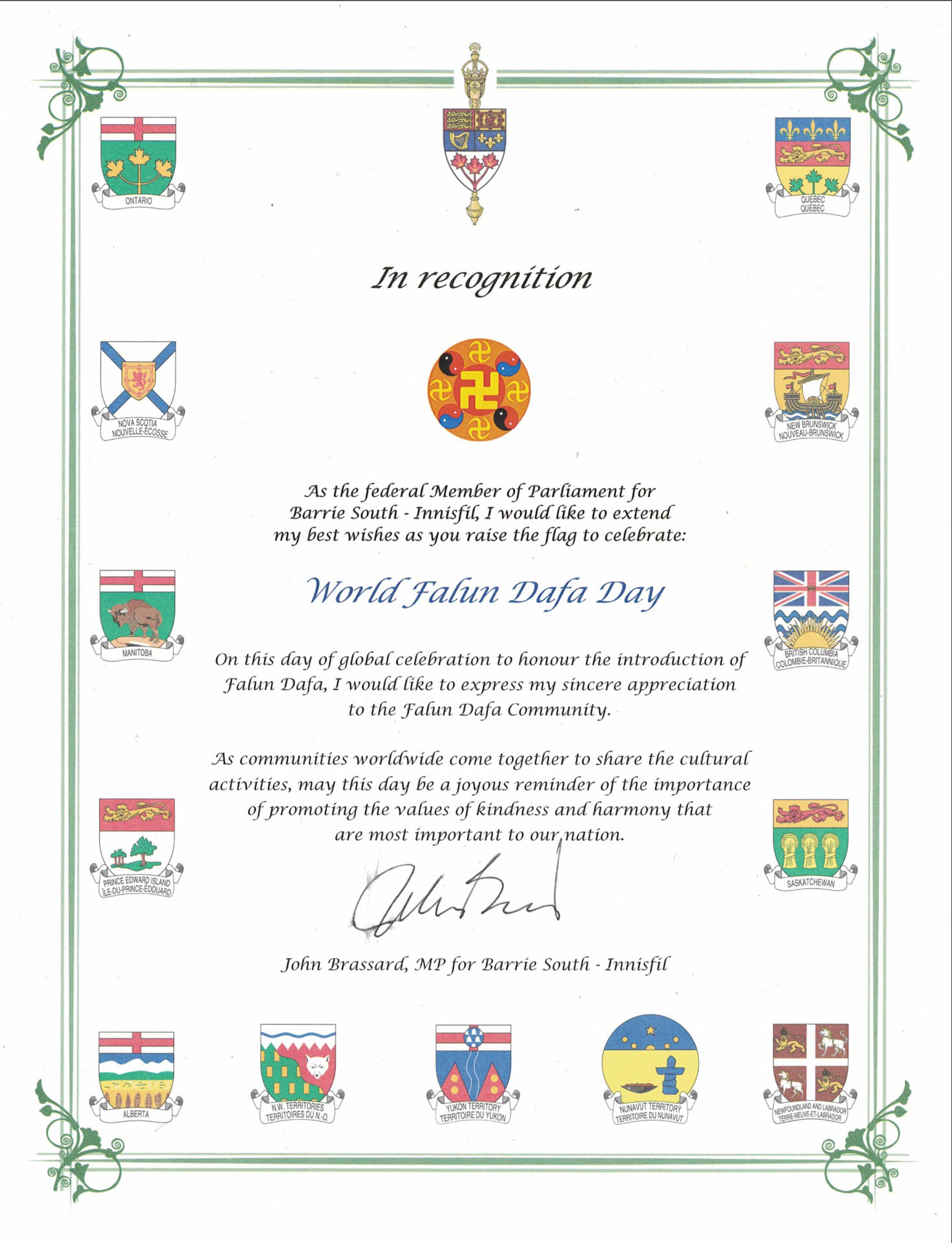 他写道:真、善、忍的原理是我们多元社会中具有深远共鸣的基本价值观。你们通过打坐和修炼,坚守弘扬这些美德,令人钦佩且意义重大。感谢加拿大法轮大法协会在全国各地社区持续推动福祉、正念和正直道德的努力。