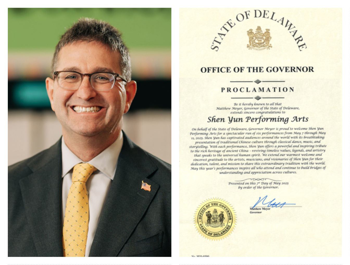 ![]() 图8:特拉华州州长马修・迈耶(Matt Meyer)向神韵艺术团颁发褒奖。(明慧网合成) |