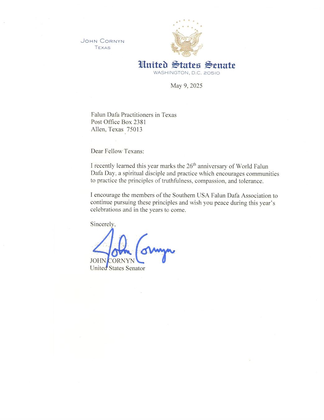 我鼓励美南法轮大法学会的成员继续坚持他们的修炼准则,并祝愿你们今年的庆祝活动以及未来的岁月平安顺利。