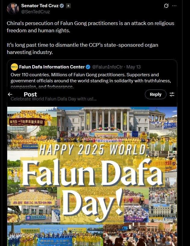 五月十三日这天,克鲁兹参议员在社媒X上转发了法轮大法信息中心发布的全球庆祝法轮大法日的消息,并在贴文中写道:“中国(共)对法轮功学员的迫害是对宗教自由和人权的公然侵犯。早已到了彻底铲除中共(CCP)国家支持的活摘器官产业的时候了。”