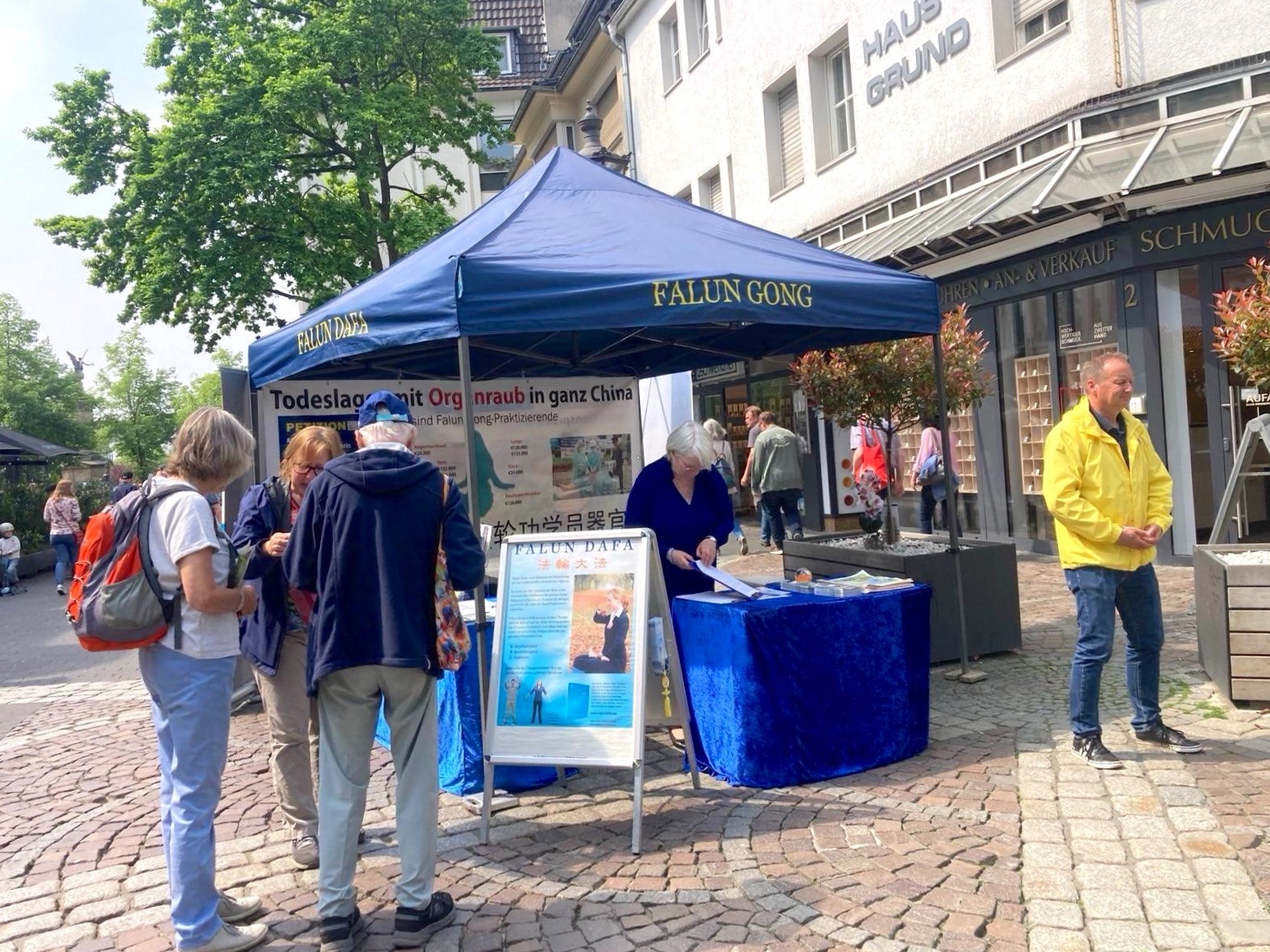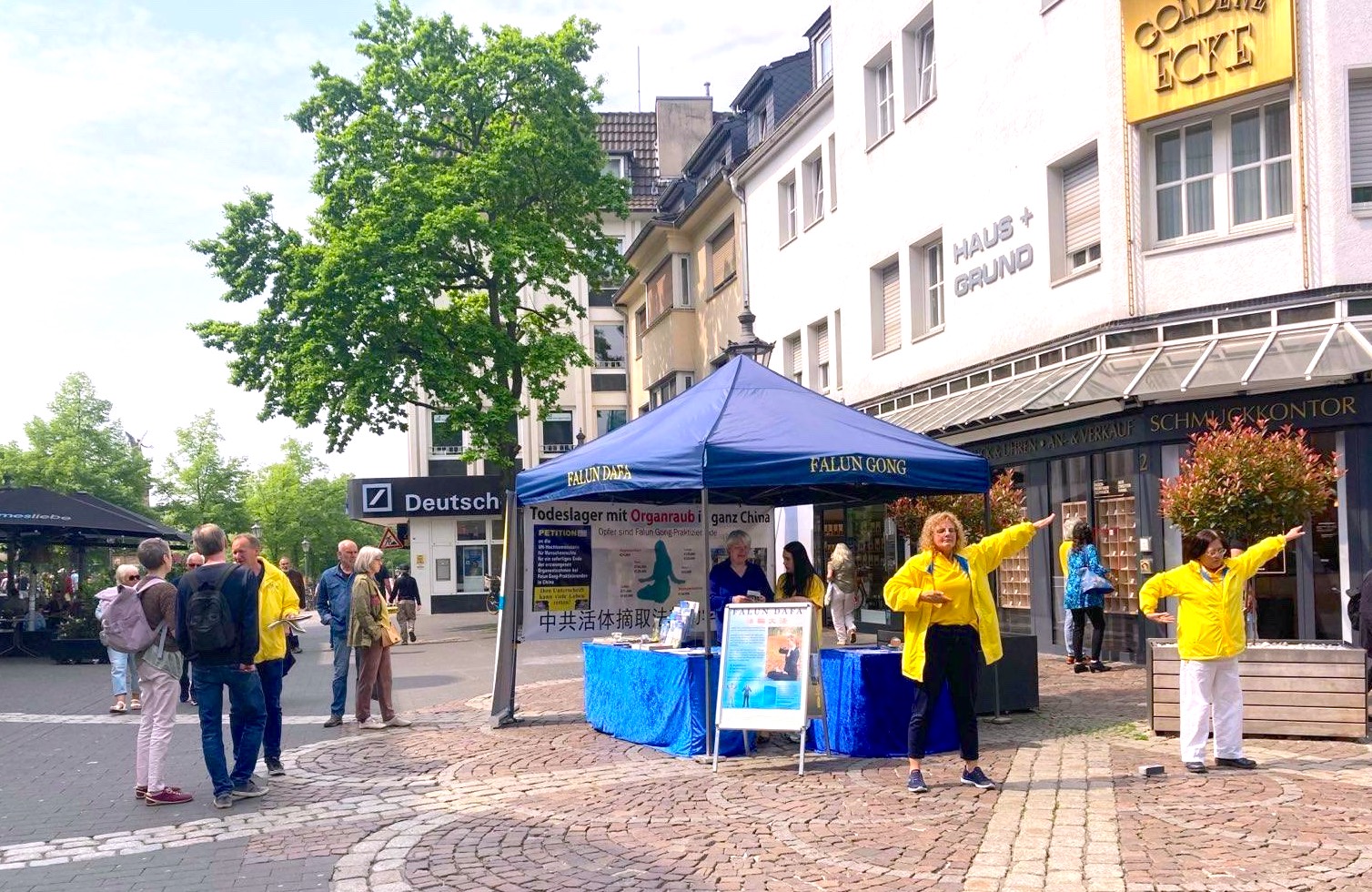 有着悠久历史的锡格堡(Siegburg)坐落在德国北威州科隆附近依山傍水的平原上,与附近喧嚣大城市氛围完全不同。法轮功学员在步行街交叉空地上,竖起介绍法轮功功法展板,挂起揭露中共迫害法轮功的横幅,部分学员开始随着音乐炼功。顷刻间,路人都慢下脚步,有人走近展板和信息台,想知道在中国发生了什么,想了解学员演示的是什么。