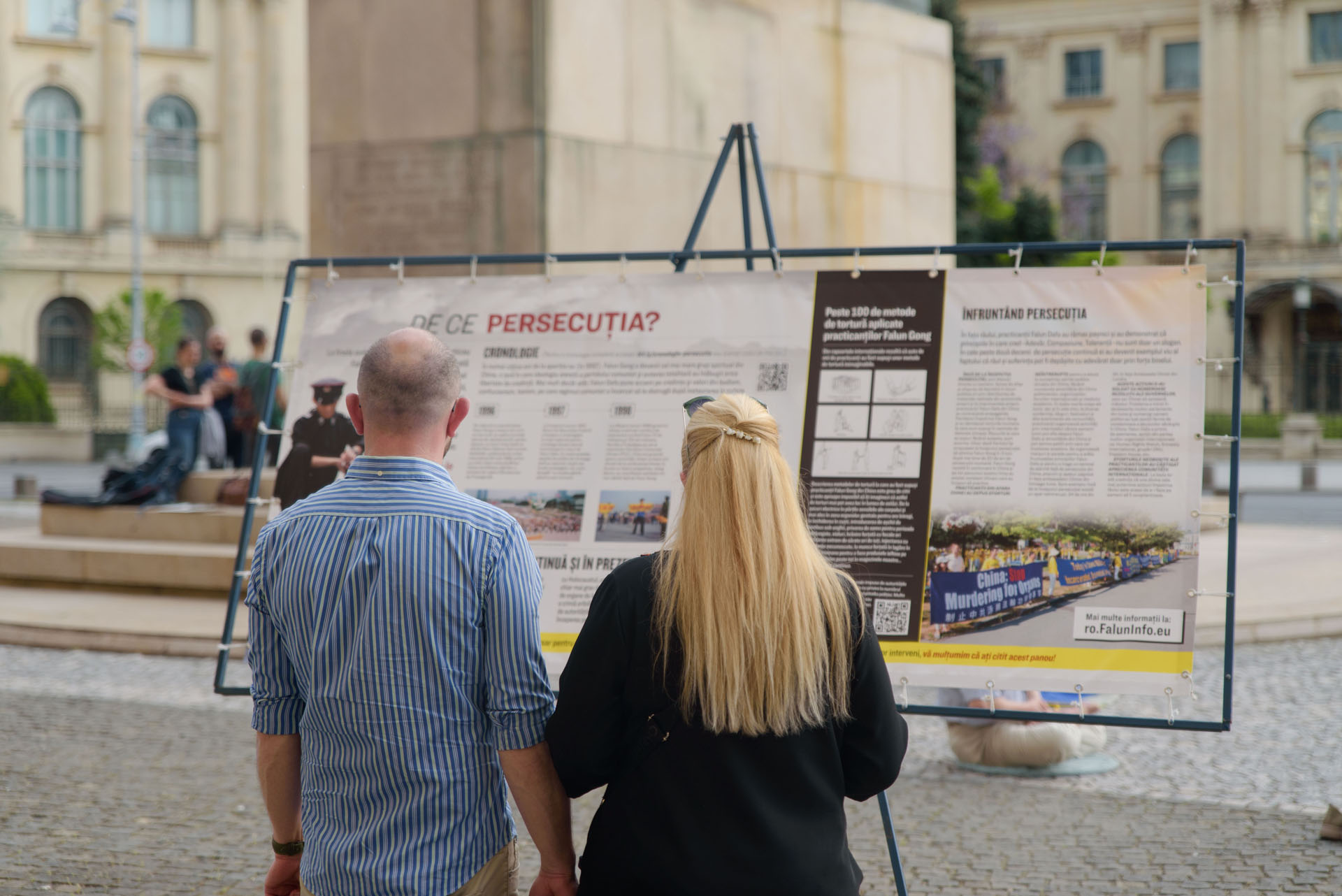 四月二十五日,法轮功学员在胜利大道(Calea Victoriei)的卡罗尔一世国王雕像旁设立真相展位;二十六日,他们在中共驻罗马尼亚大使馆前举行和平集会,要求立即停止迫害法轮功;二十六和二十七日上午,学员在米哈伊一世国王公园举行集体炼功和弘法活动。