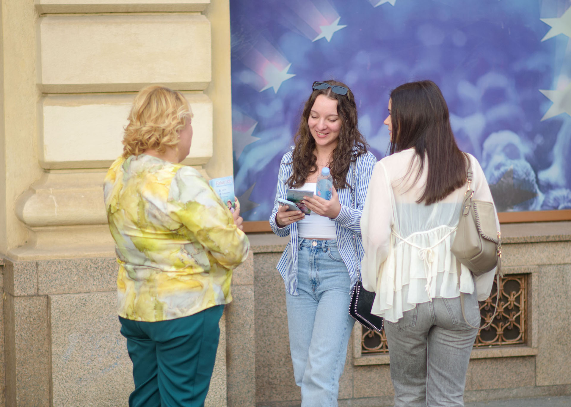 一位中年妇女一开始看到学员递过来的传单时拒绝了,她刚要离开,听到学员说起法轮功简要介绍,就收回了脚步,她觉得真、善、忍的理念非常美好。