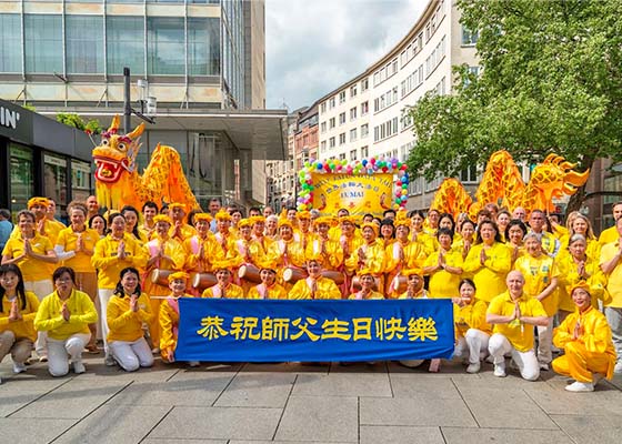 五月三日,法轮功学员欢聚在德国法兰克福采尔大街,庆祝即将来临的五月十三日第二十六届世界法轮大法日。