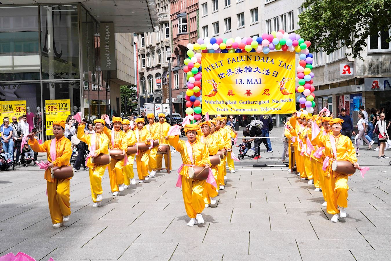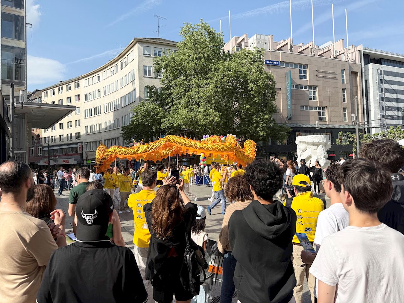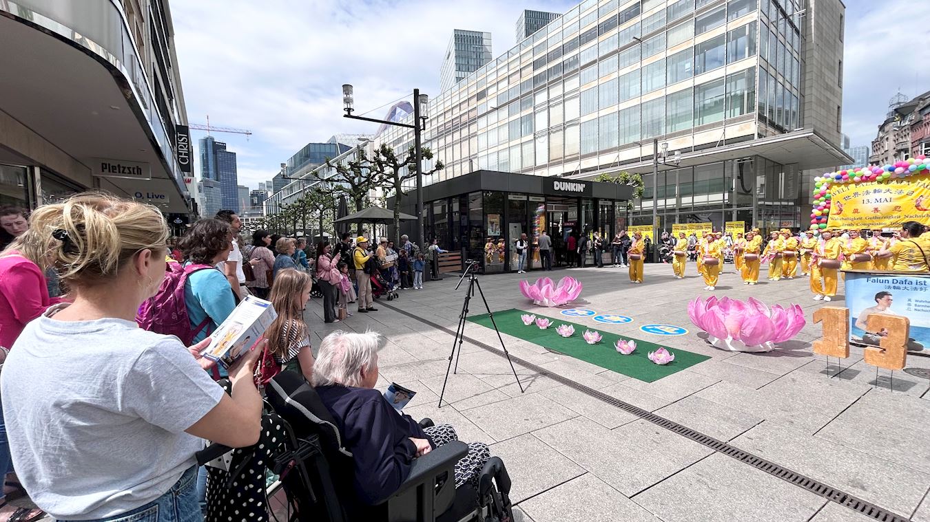二零二五年五月三日,法轮功学员在德国金融中心法兰克福采尔大街(Zeil)举办大型集会活动,庆祝第二十六届世界法轮大法日和法轮大法弘传世界三十三周年,恭祝法轮功创始人李洪志师尊华诞。德国黑森州四位政要发来贺信支持。