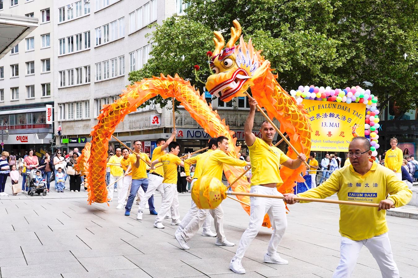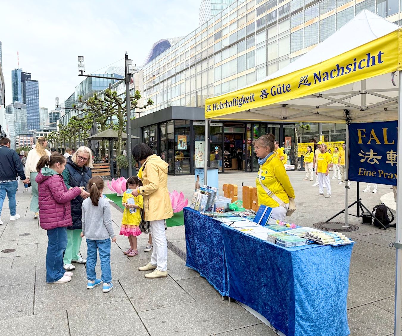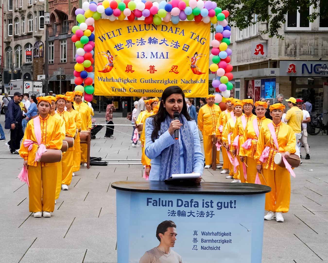 二零二五年五月三日,法轮功学员在德国金融中心法兰克福采尔大街(Zeil)举办大型集会活动,庆祝第二十六届世界法轮大法日和法轮大法弘传世界三十三周年,恭祝法轮功创始人李洪志师尊华诞。德国黑森州四位政要发来贺信支持。