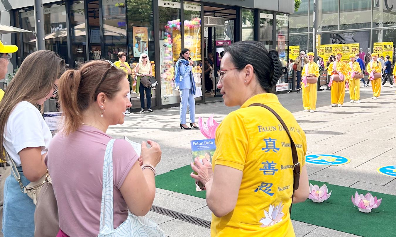 随后,法轮功学员代表向民众介绍什么是法轮功,以及大法弘传世界的盛况。并宣读德国黑森州政要为本次庆祝活动发来的贺信。法轮功腰鼓队也前来助兴表演。学员还以向路人讲真相,派发大法传单以及发送莲花等传递法轮功的美好,与民众共同庆祝即将到来的世界法轮大法日。