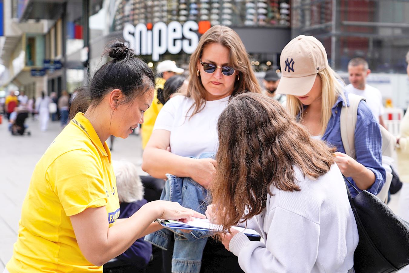 学员笑着回答:“这一天是我们师父的生日。” 凯瑟琳睁大眼睛说:“原来是这么回事。”学员立刻走向不远处的真相展位,取来了两张英文版的法轮大法传单递到她们手里。