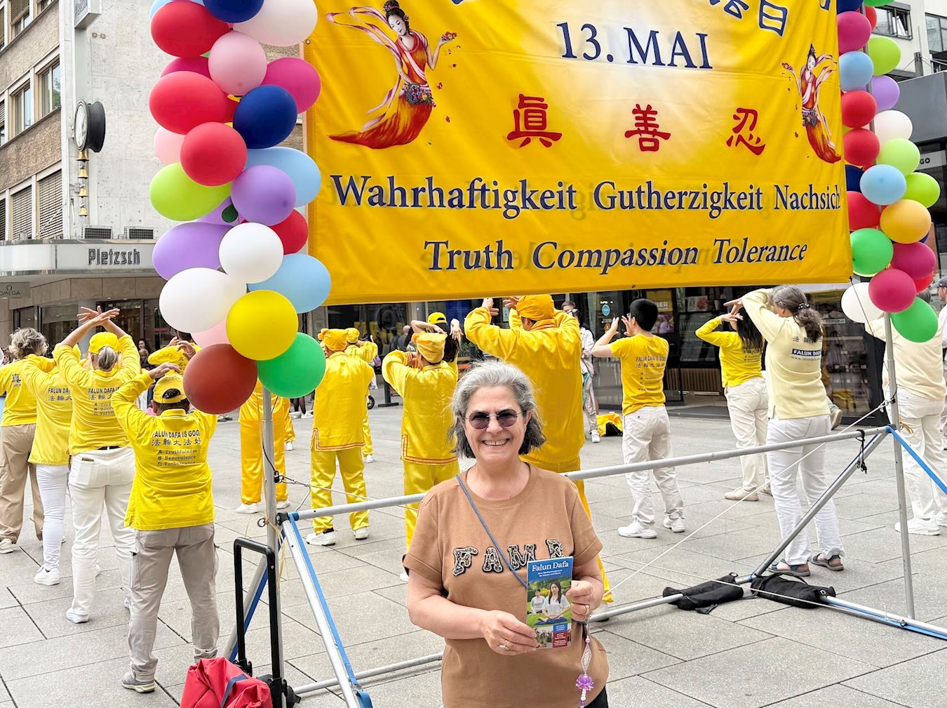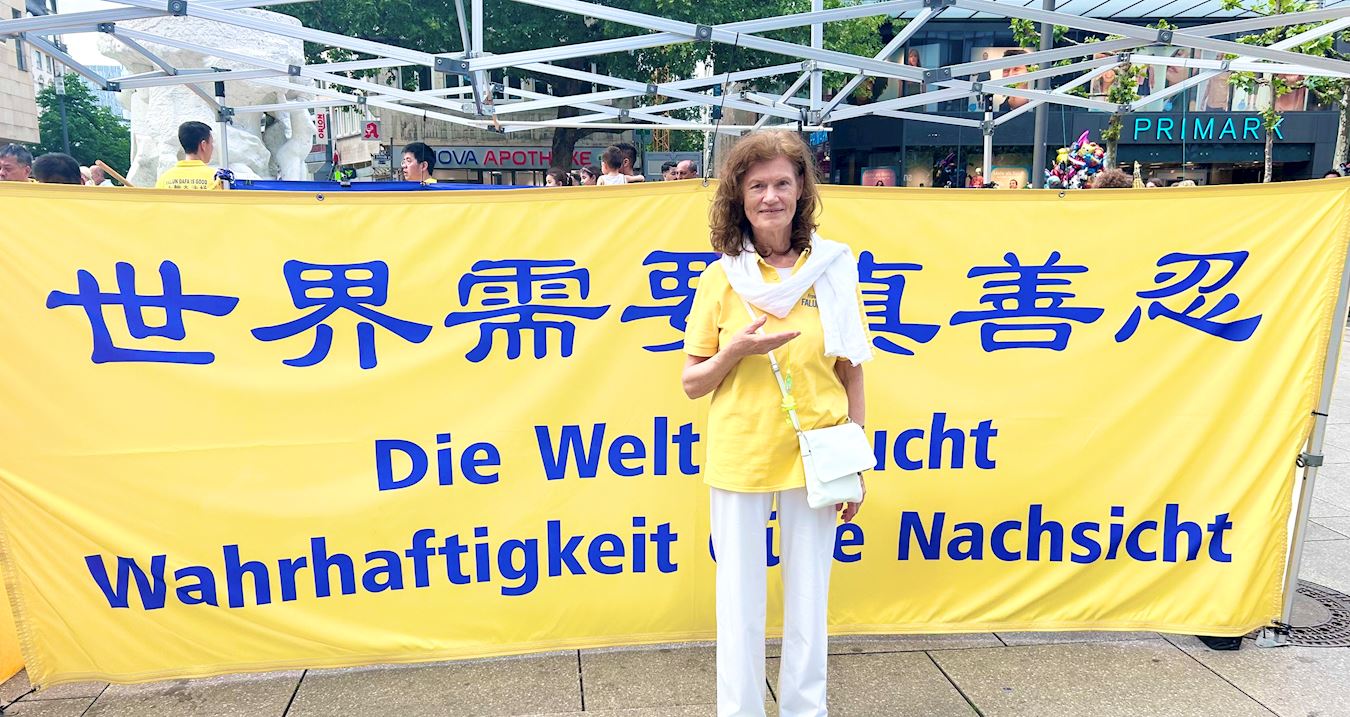 瓦尔陶特(Waltraud)是一名修炼多年的法轮功学员,今天,和其他来自德国各城市的法轮功学员一样,她满面笑容表达了自己的愉悦,以及对李洪志师父的感恩。