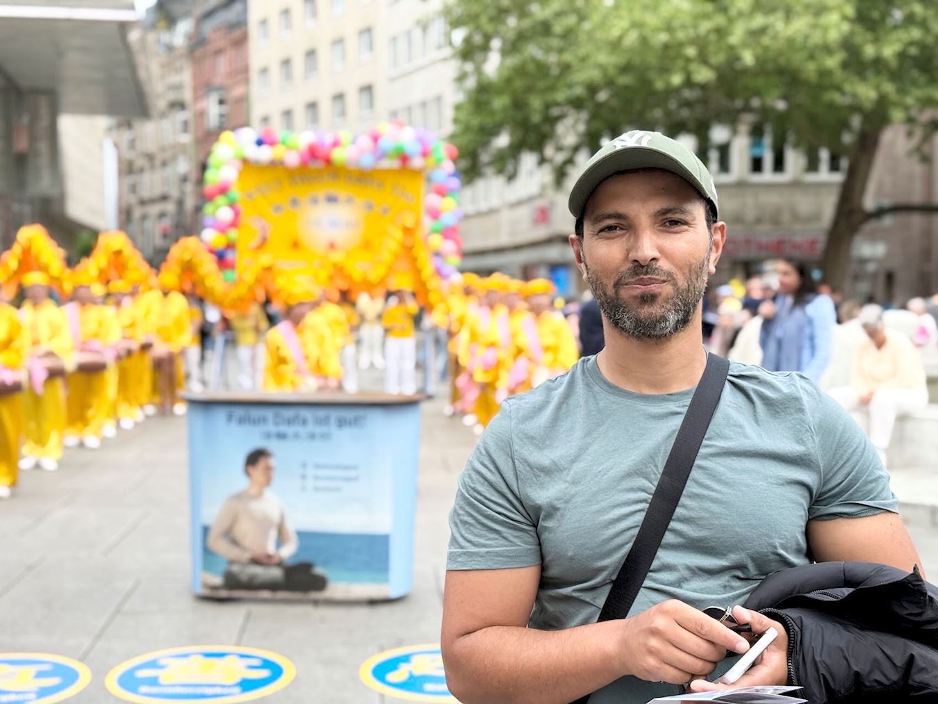 从慕尼黑来游玩的哈姆萨(Hamza)先生站在一旁饶有兴致的观看法轮功学员的庆祝表演。