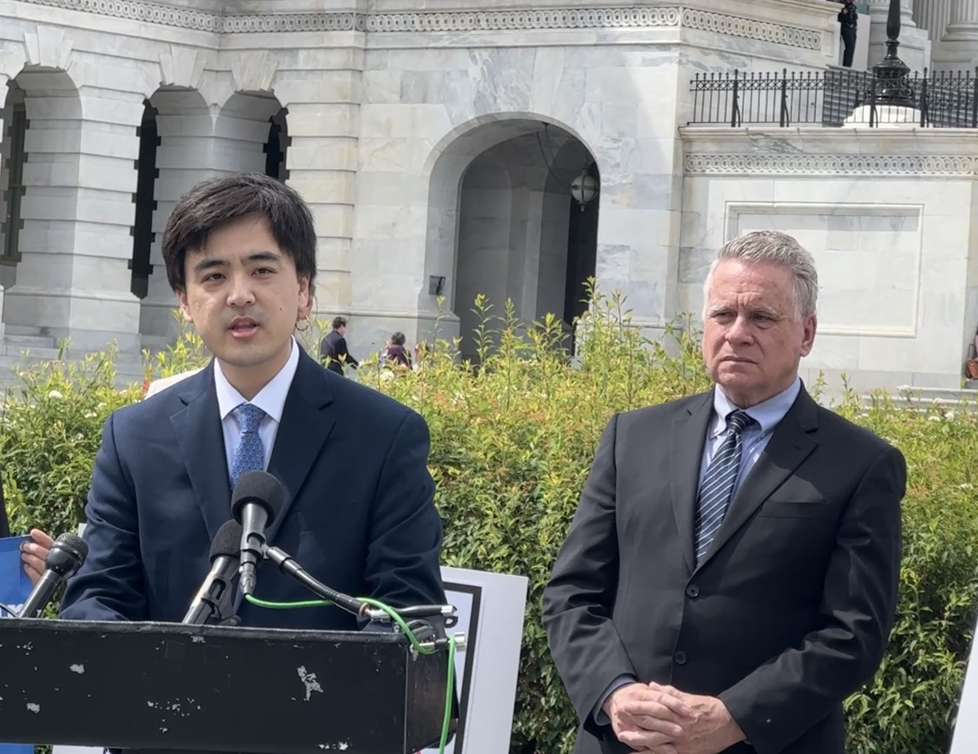 图4:二零二五年五月七日下午,法轮大法信息中心代表马克·杨在国会大厦前举行的记者会上发言。