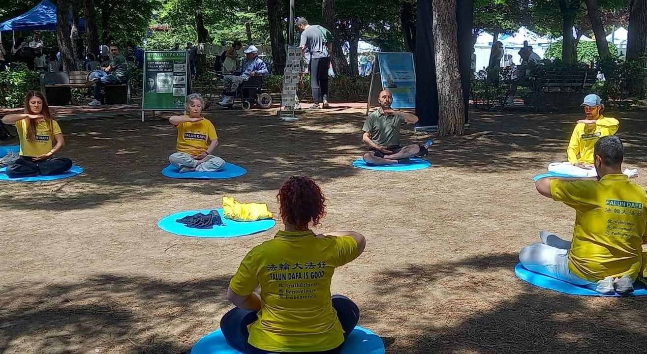 ![]() 图1:伊斯坦布尔的部分法轮功学员在环境节向人们展示法轮功功法 |