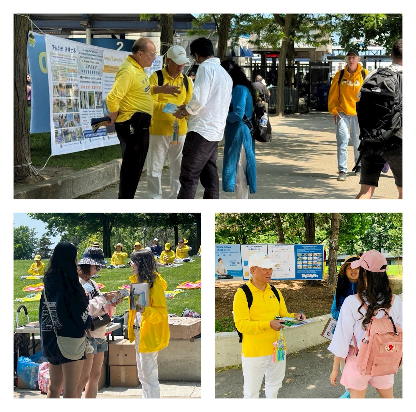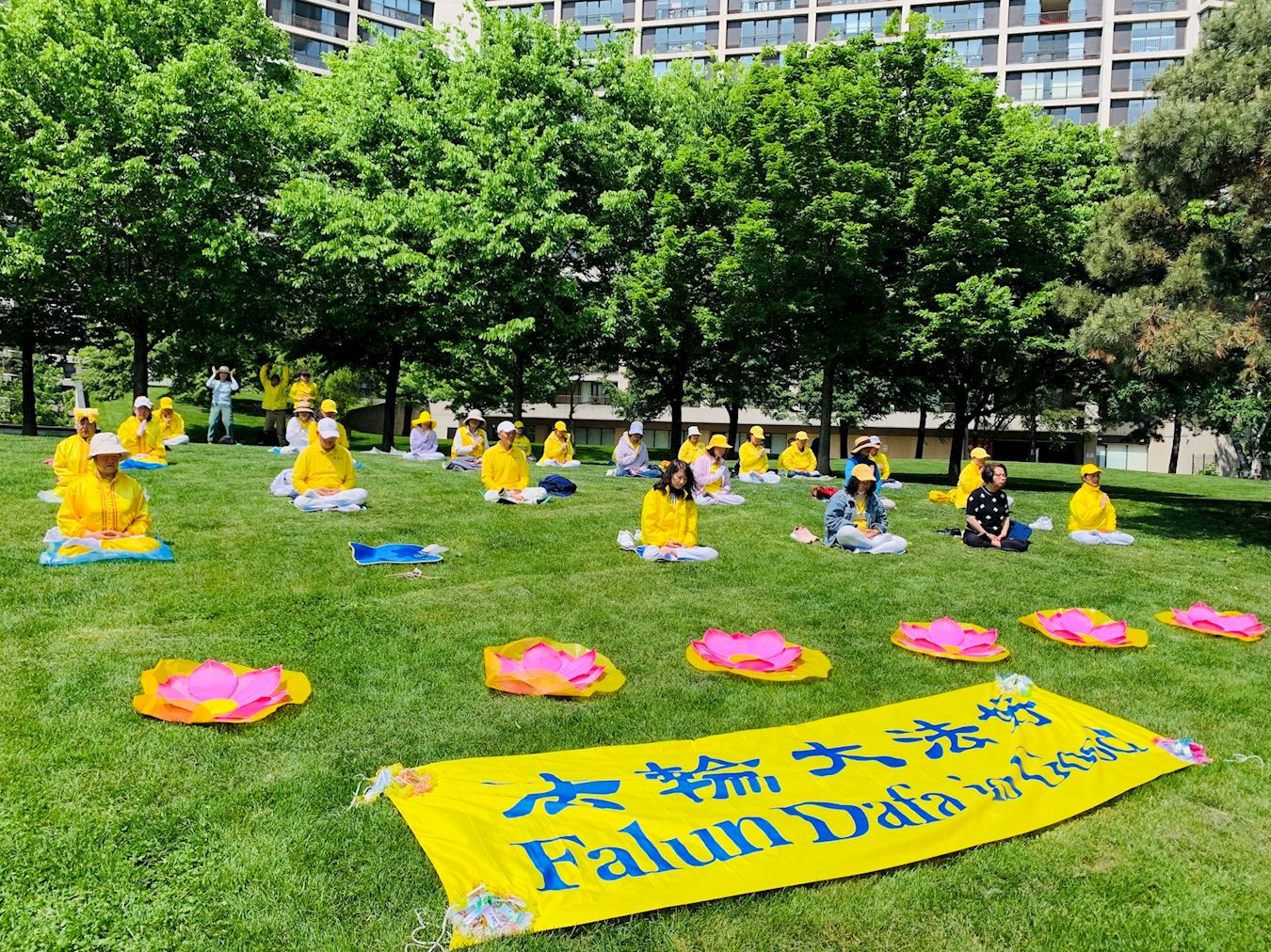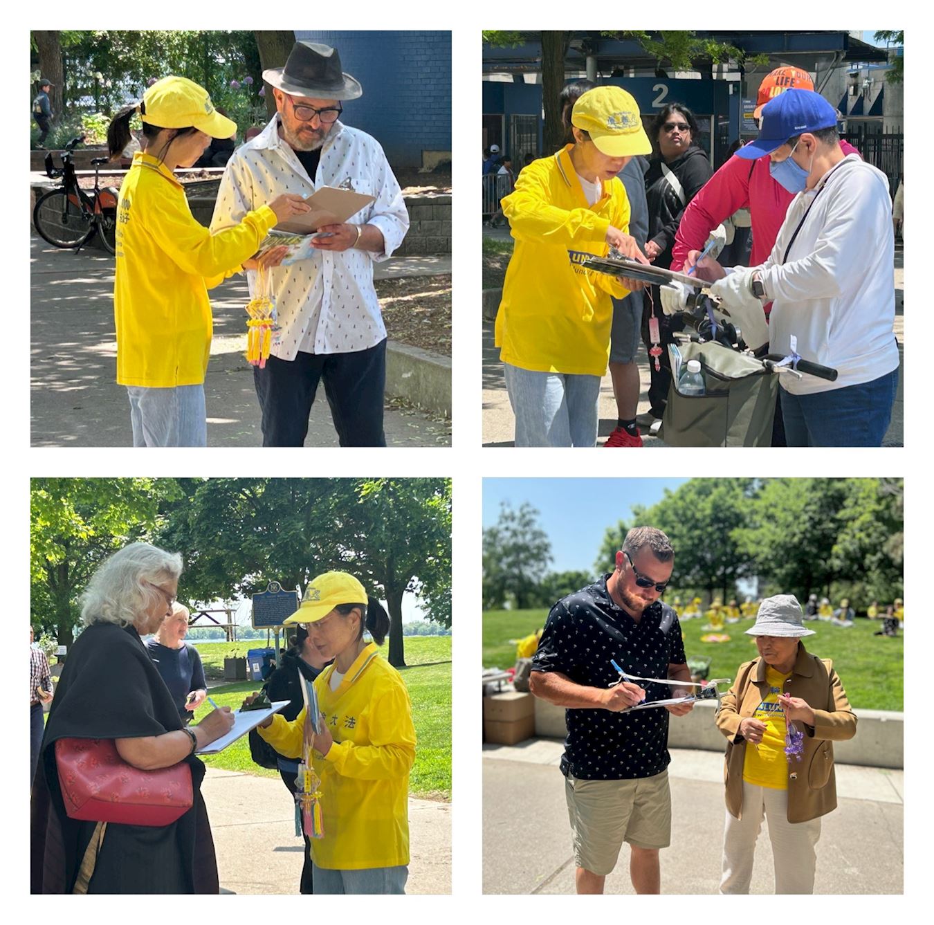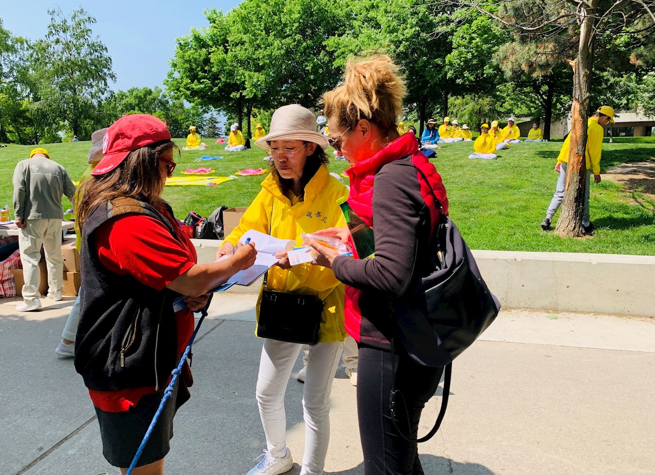 暖和的天气、和煦的阳光,多伦多的法轮功学员们在码头广场公园(Harbour Square Park)的大草坪上一早就开始了一整天的炼功、讲真相和征签活动,这里是市民及各地游客乘坐轮船前往湖心岛的必经之路。很多人都停下来拍照和听学员们介绍法轮功并签名反迫害,今年的G7+7(编者注:G7七国集团+欧盟国家+阿根廷、澳大利亚、印度、以色列、墨西哥、南韩和台湾)在加拿大召开,近日是法轮功学员给G7+7请愿书——《制止中共强制摘取器官》的征签活动,到六月近二十万个签名给G7+7。