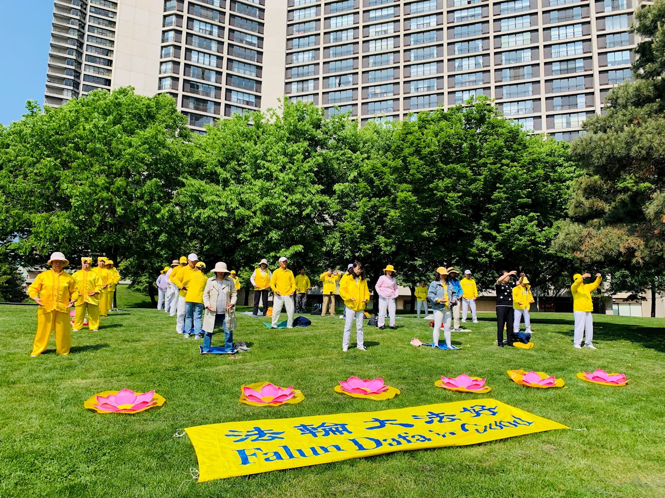 ![]() 图1~2:多伦多的法轮功学员们在码头广场公园(Harbour Square Park)的大草坪上集体炼功 |