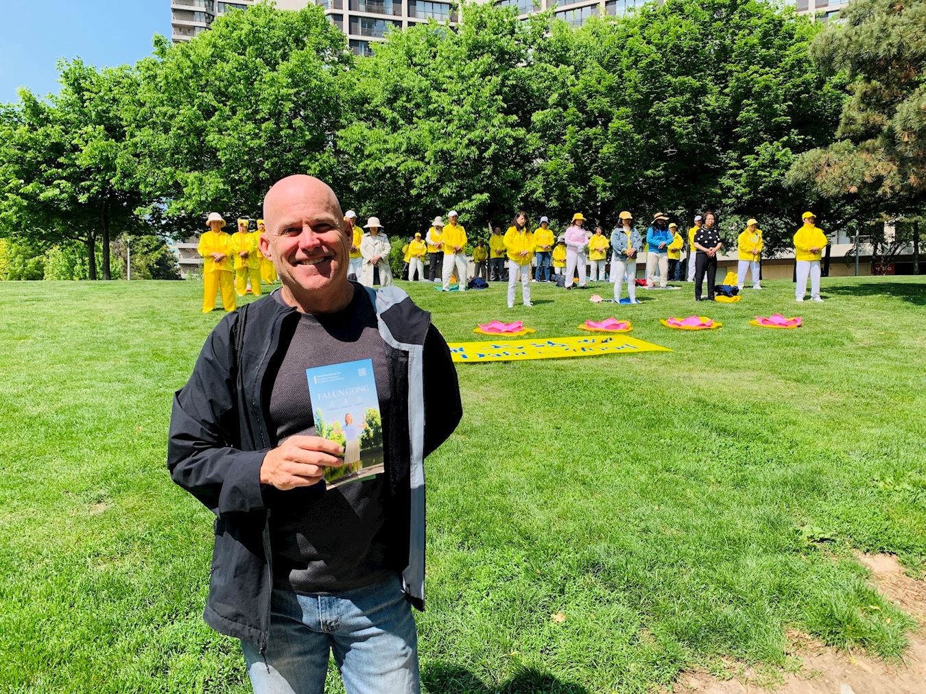 兰迪(Randy)被真相横幅和炼功场景所吸引,主动走入炼功场来了解。他说自己是首次听说法轮大法。他看到学员们平静地坐在草坪上,在阳光下做着炼功动作,看着觉得非常美好。