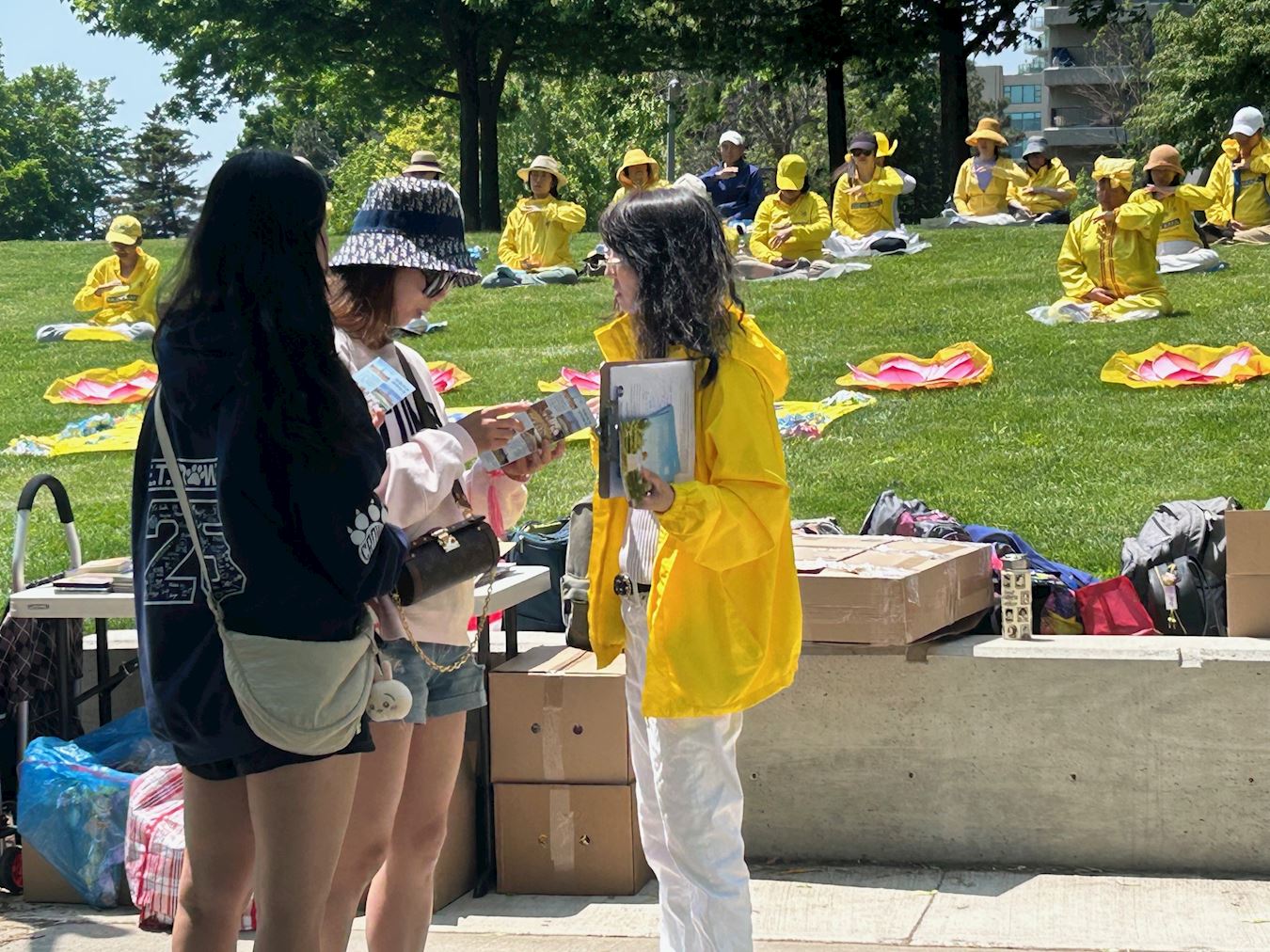 两位年轻的华人女大学生来到炼功场前,她们主动来看大法的功法介绍传单,并表示很喜欢带有“法轮大法好 真善忍好”字样的小莲花。当学员向她们介绍大法时,她们表示自己以前有了解过一些大法真相,她们也同样认为中共真的太坏了。