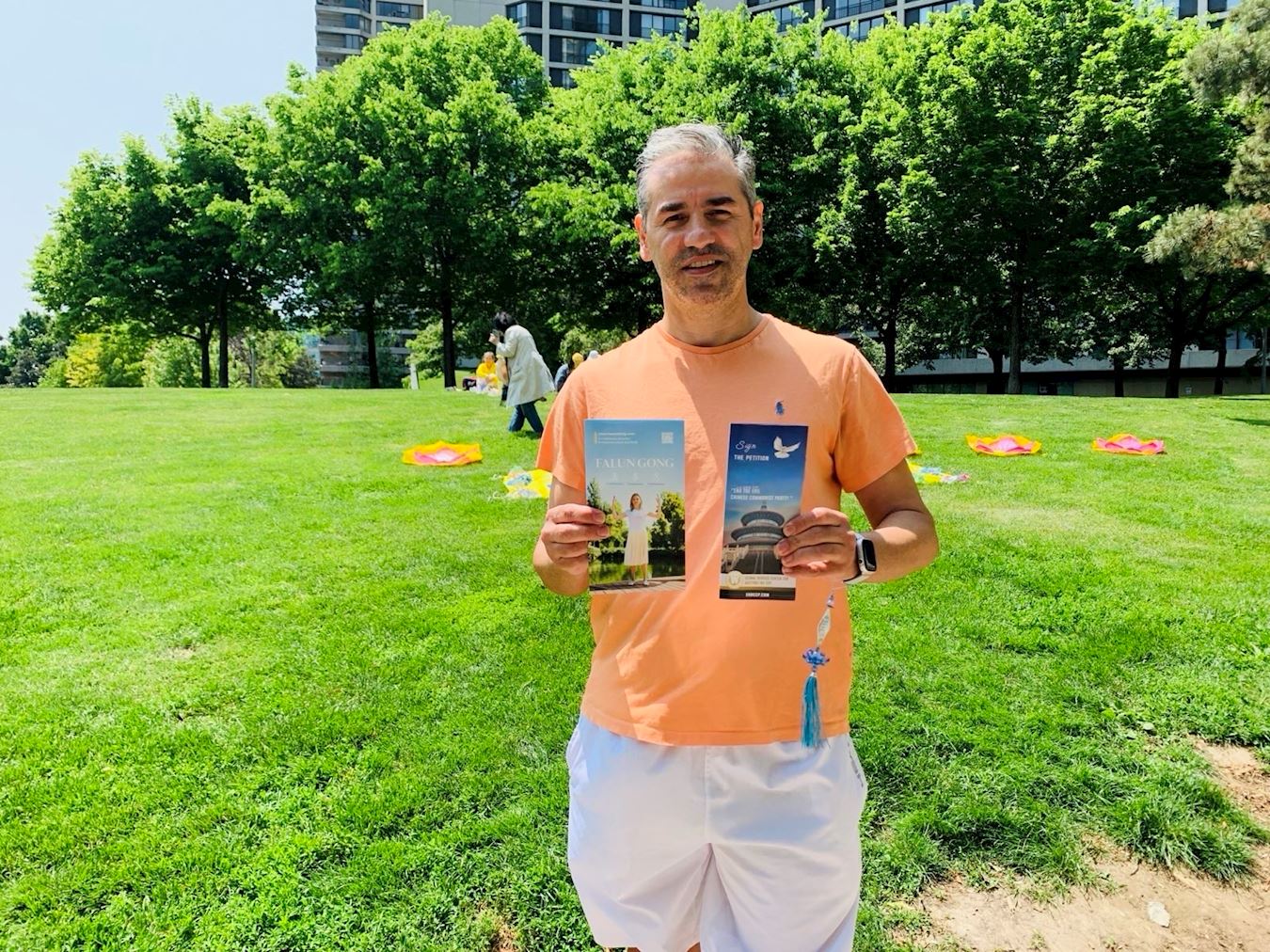 亚伦(Aaron)是一名多伦多的学生,也是个体经营者。他表示自己在两年前就在多伦多多处公园里见到过法轮功学员。他自己在家也有过打坐的经历。亚伦在听完学员讲述中国大陆法轮功学员正在遭受的迫害情况后,表示简直难以置信:只是安静的在户外或家中打坐、学法,就会被关起来。他为学员们在这里能拥有自由的炼功环境感到欣慰。他坚定地在征签表上签名。