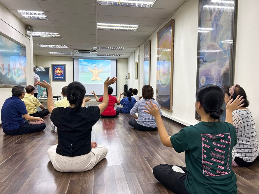 ![]() 图2:参加九天班的学员正在学炼法轮功第五套功法——神通加持法。 |
