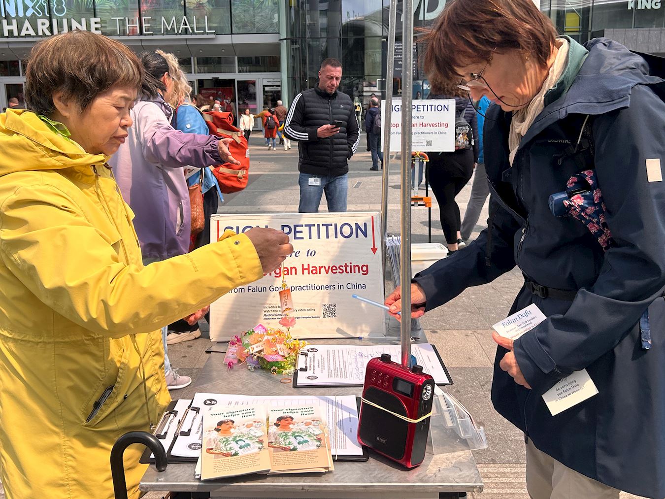 许多人停下脚步来了解法轮大法,他们被真、善、忍的信息所感动,并对法轮大法的普世价值和法轮功学员和平理性的反迫害方式表示钦佩,许多人主动在请愿书上签名,表达对法轮功的支持。