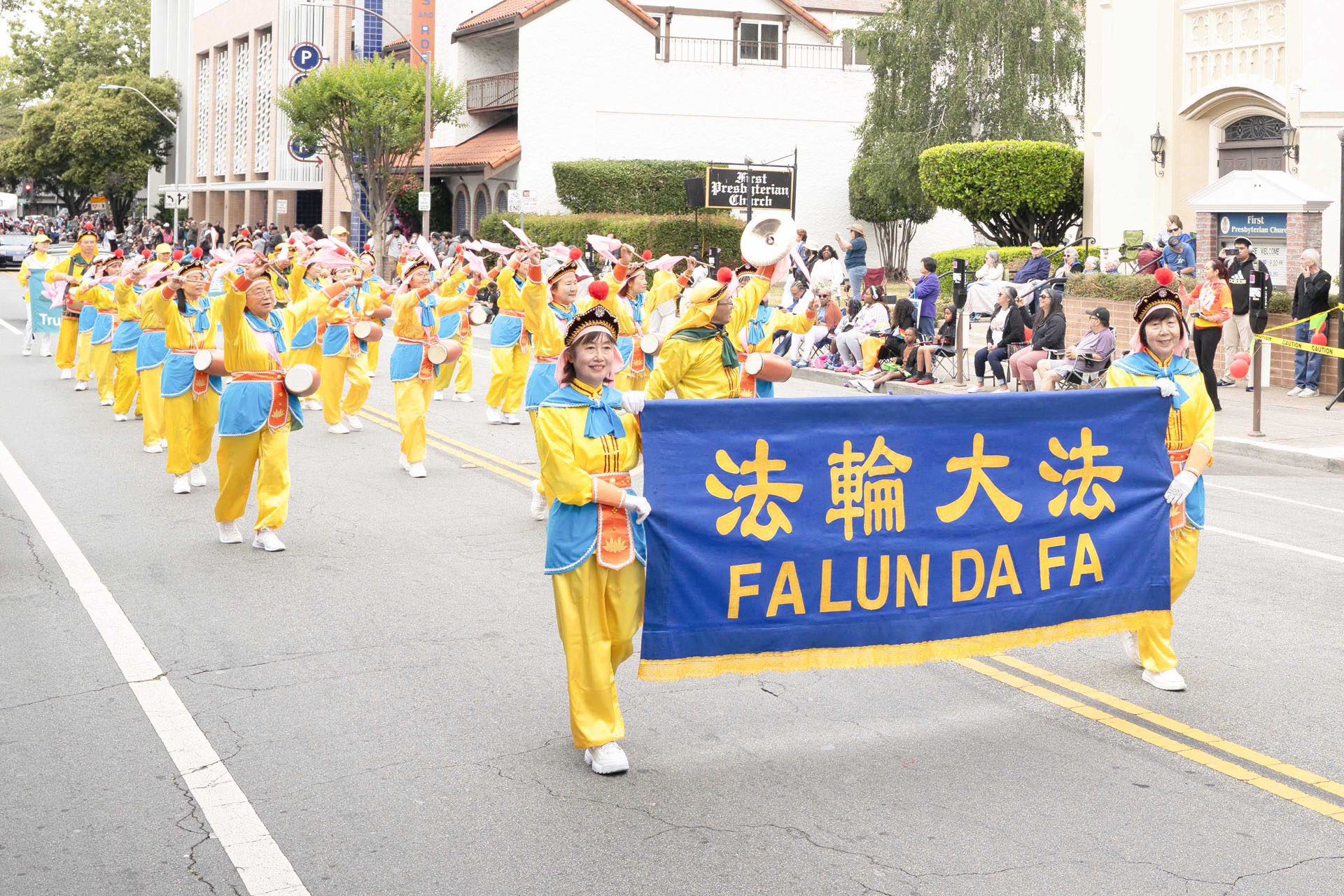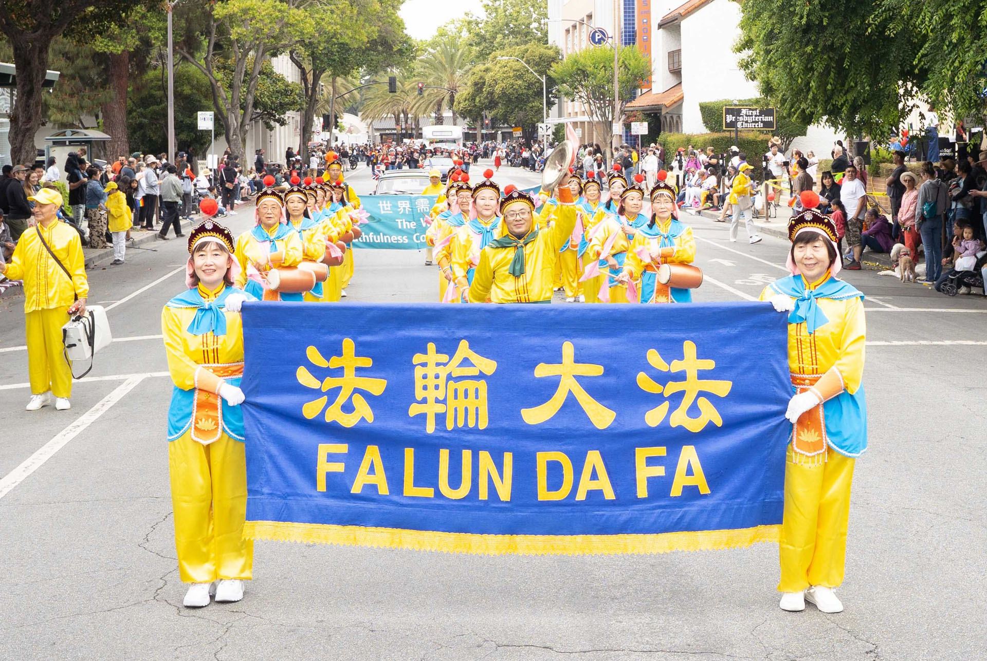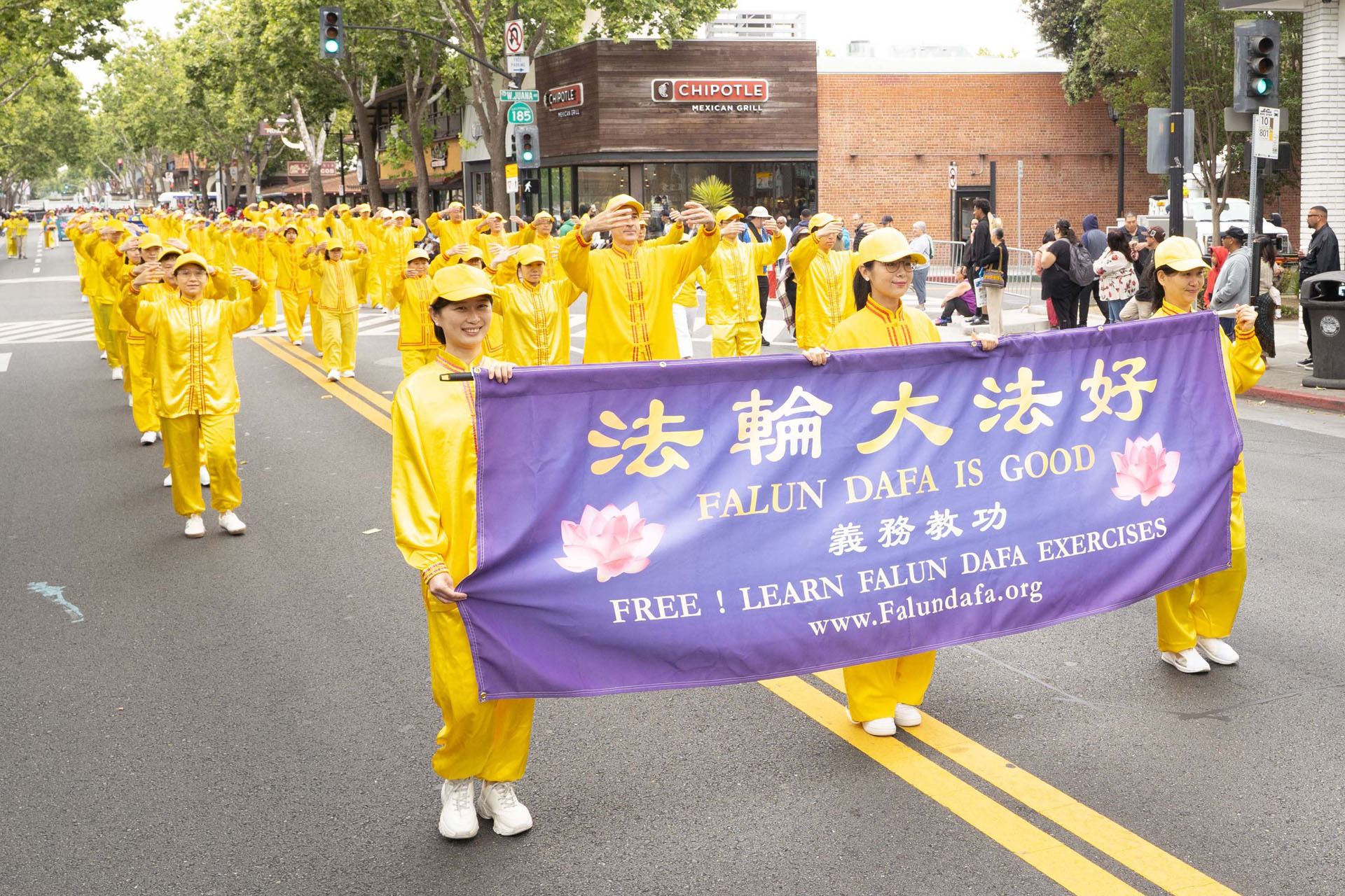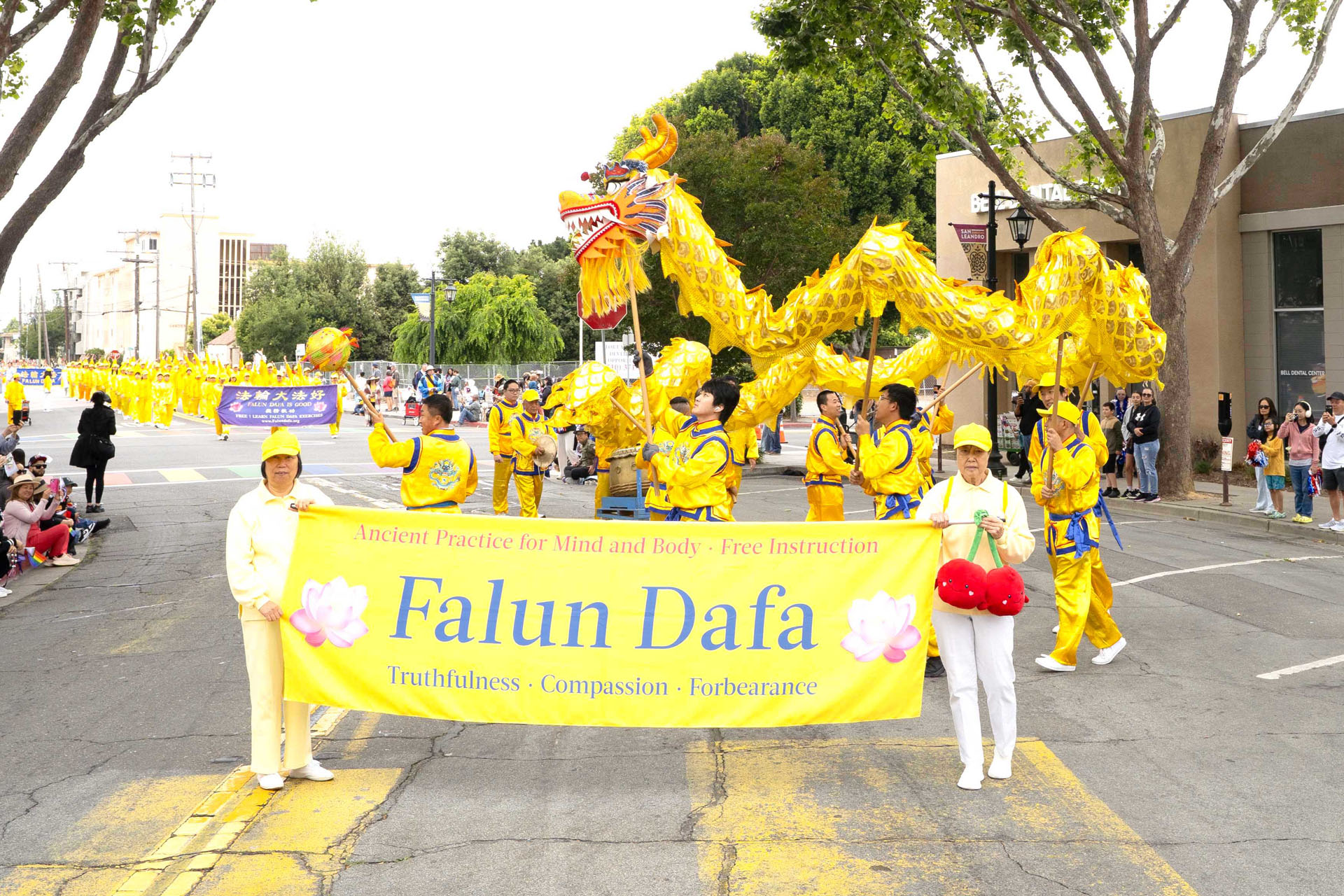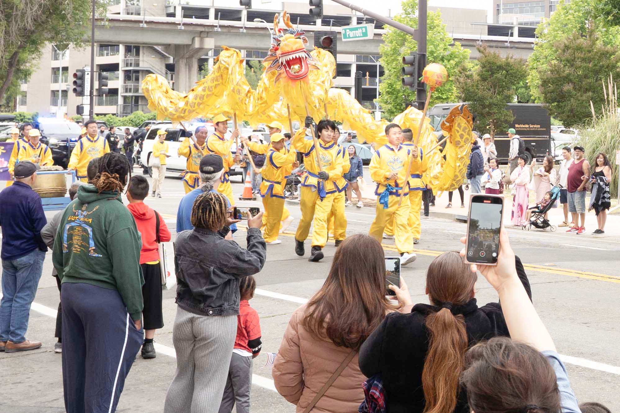 由旧金山湾区的法轮功学员组成的炼功队、腰鼓队和舞龙参加了游行活动。这是舞龙队第一次参加此次游行。一路上,法轮功学员的队伍一亮相,街道两旁的观众就欢呼起来。