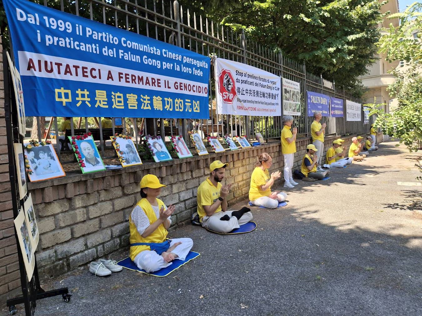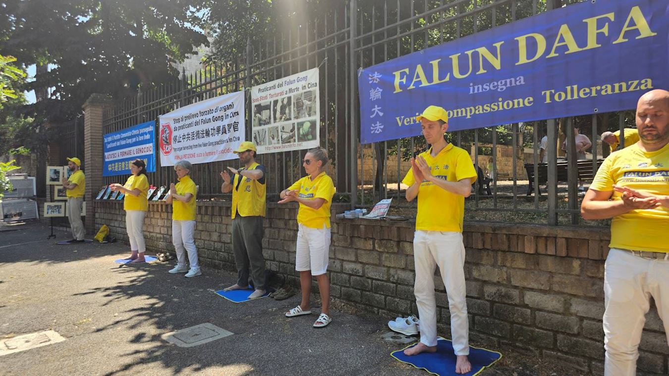 当天上午在中共驻罗马大使馆(Largo Ecuador)附近,法轮功学员举行了和平静坐活动,悼念在过去二十六年中被中共迫害致死的法轮功修炼者,制止中共自一九九九年七月开始的这场对法轮功学员全球性的迫害。