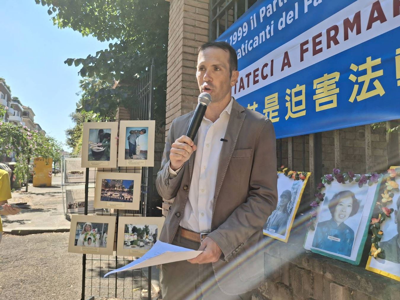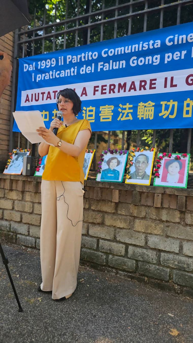 【明慧网二零二五年七月十一日】时值法轮功学员反迫害二十六周年之际,二零二五年七月四日,来自意大利各地的法轮功学员在首都罗马(Roma)中使馆举办了反迫害活动。集会上,学员宣读了多位意大利政要声援法轮功反迫害的来函。罗马市议会副主席皮特兰杰罗·马萨罗到场声援,当天,他刚刚在罗马市政府第十二区推进了一项《制止迫害法轮功》的动议。