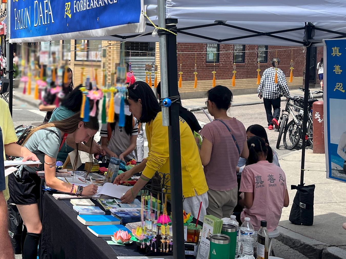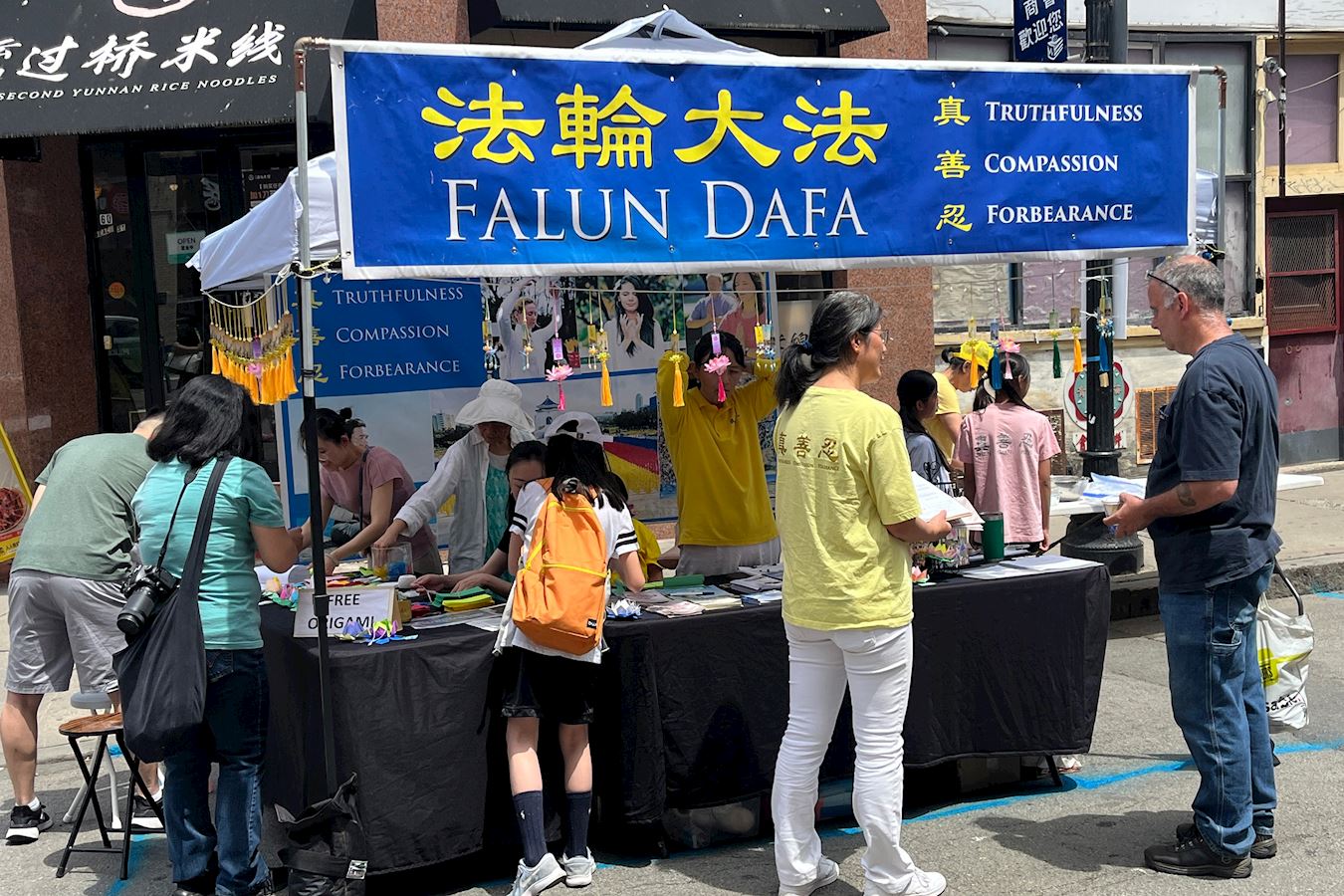 图1:二零二五年七月五日,波士顿中国城华埠主街的夏日节庆活动。法轮功展位上参观的民众络绎不绝,有的与学员交谈了解更多法轮功的讯息。