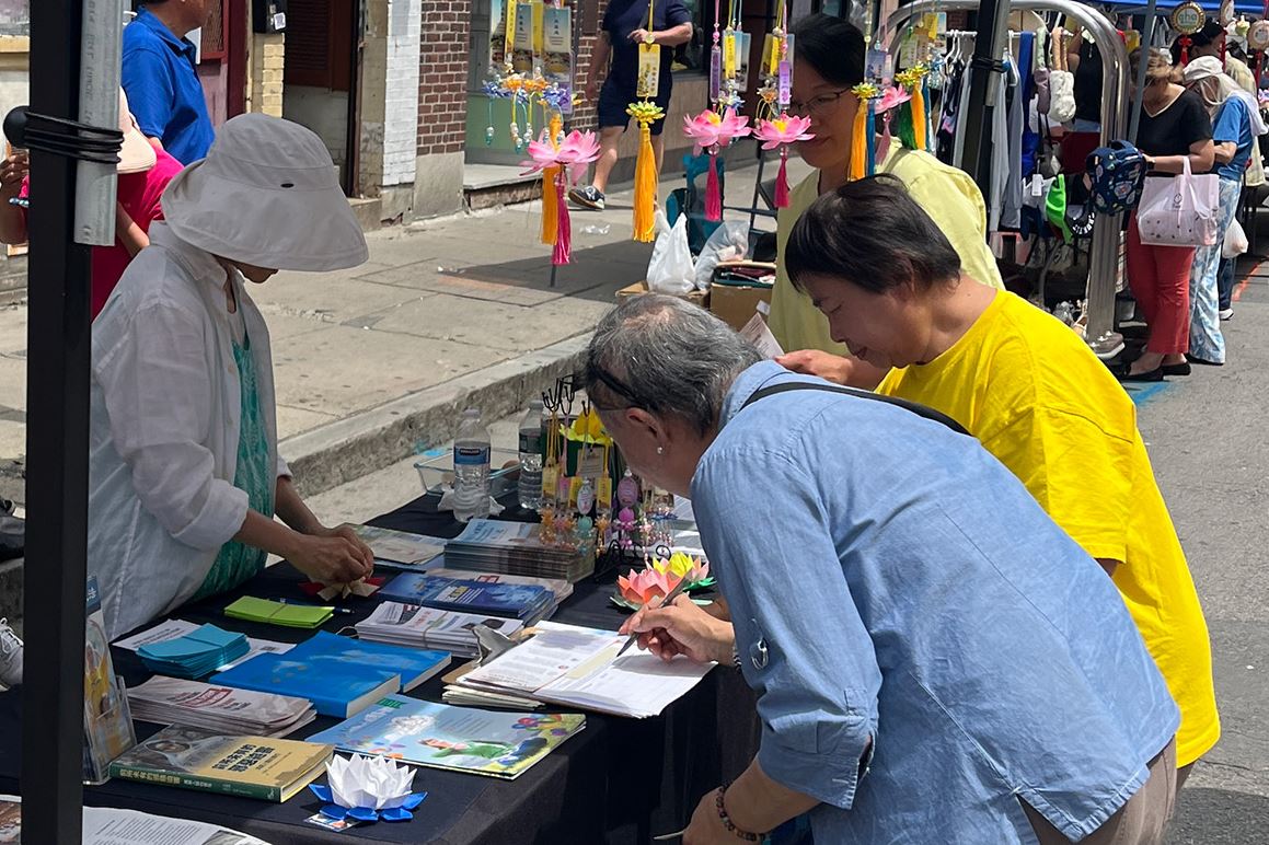 【明慧网二零二五年七月十二日】来自美国麻萨诸塞州的部分法轮功学员于二零二五年七月五日,参加了位于波士顿中国城华埠主街的夏日节庆活动。法轮功设立展位,前来参观的民众络绎不绝,除了本地居民,还有美国其他州和来自外国的游客。市民及华人明白真相后纷纷签名支持参议院能尽速通过《法轮功保护法案》。