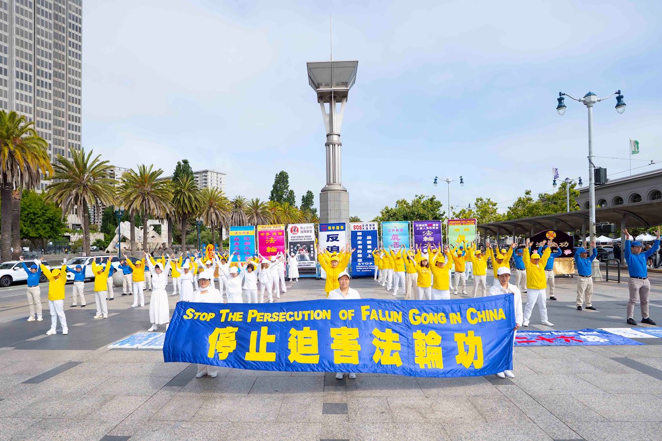 '图1~2:二零二五年七月十二日,法轮功学员首先在旧金山渡轮大厦(Ferry Building)前炼功'