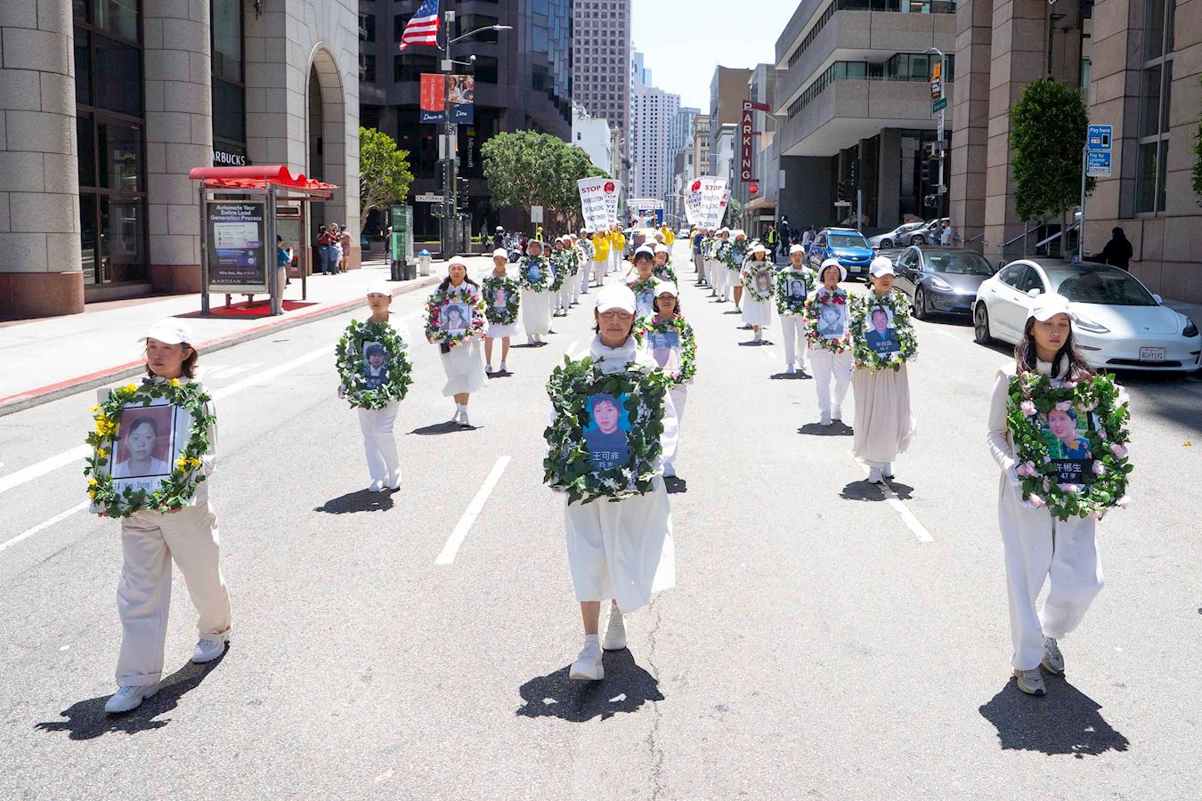 第二方阵“停止迫害法轮功”,有要求停止迫害的横幅、反酷刑车和展板以及白花圈队,讲述了二十六年来中共对善良法轮功学员惨绝人寰的迫害。仅今年上半年,已知有430名法轮功学员被非法判刑,76人在迫害中离世,2003人被绑架、骚扰。