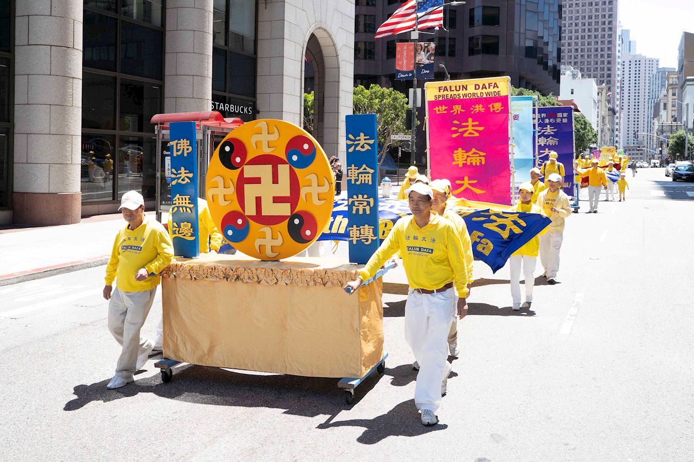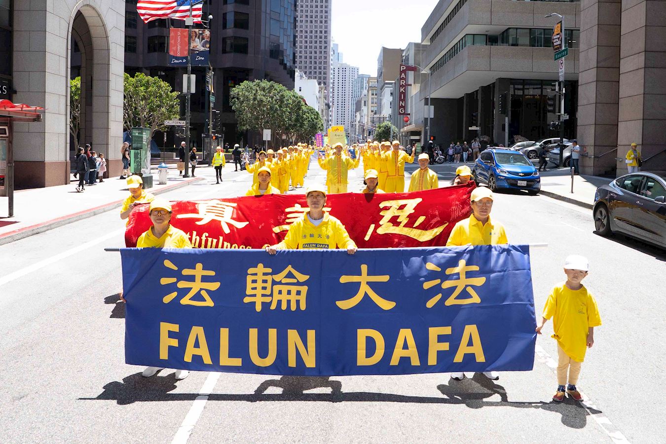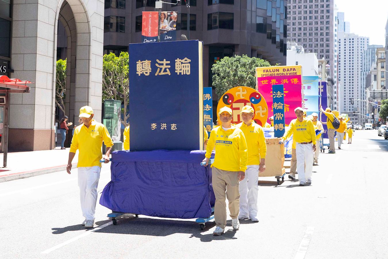 上午十二点,法轮功学员举行的游行,从渡轮大厦出发,沿着市场街、经过市区主要街道,到达唐人街花园角广场(Portsmouth Square)。