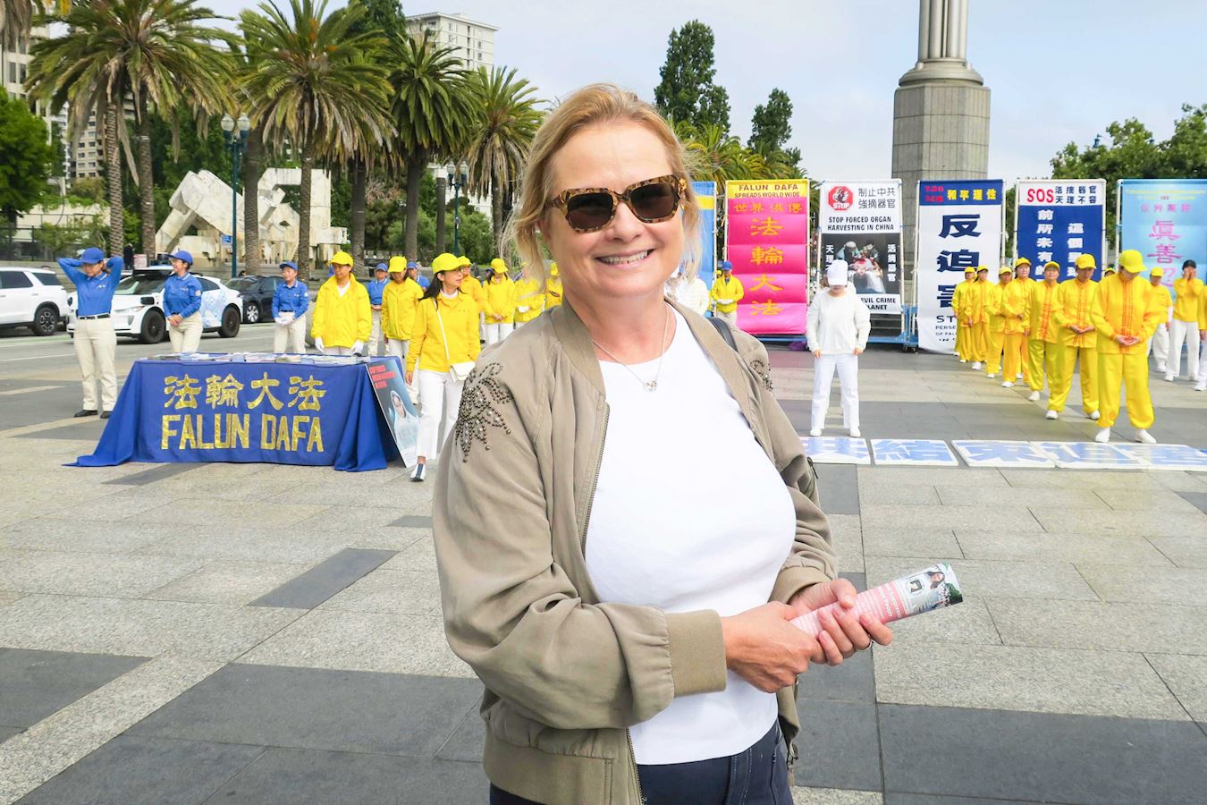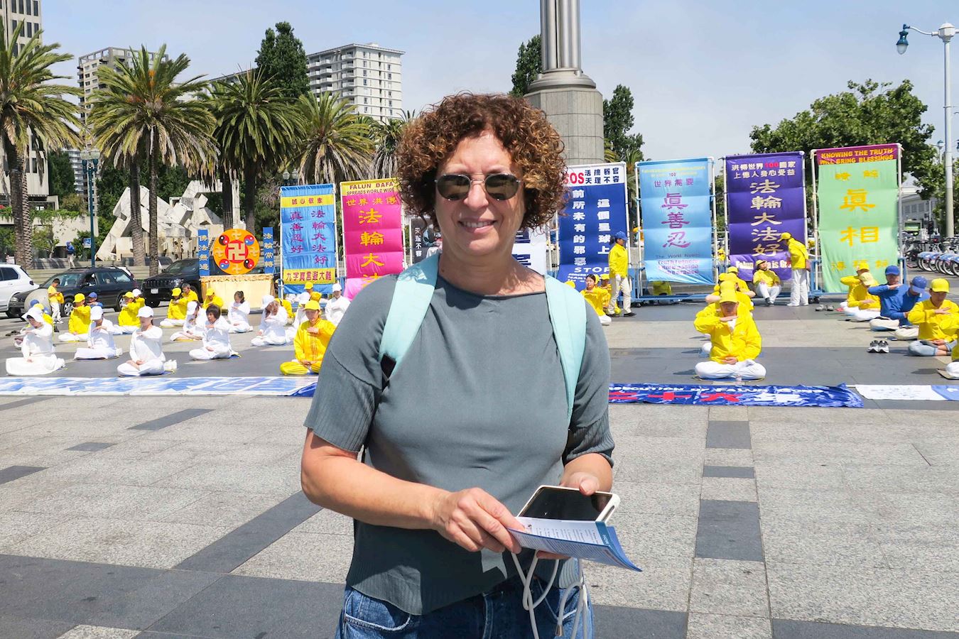 旧金山居民丽莎·法恩(Lisa Fine)一直在追踪法轮功在中国受迫害的情况,当她经过反迫害活动现场时,停下拍照。法恩说,“我来自欧洲,以前住在瑞士时就一直关注法轮功在中国受迫害的情况,特别是中共活摘器官罪行,中共的恶行令人作呕。我们应该要让更多的人知道中共的邪恶行径,制止迫害。”