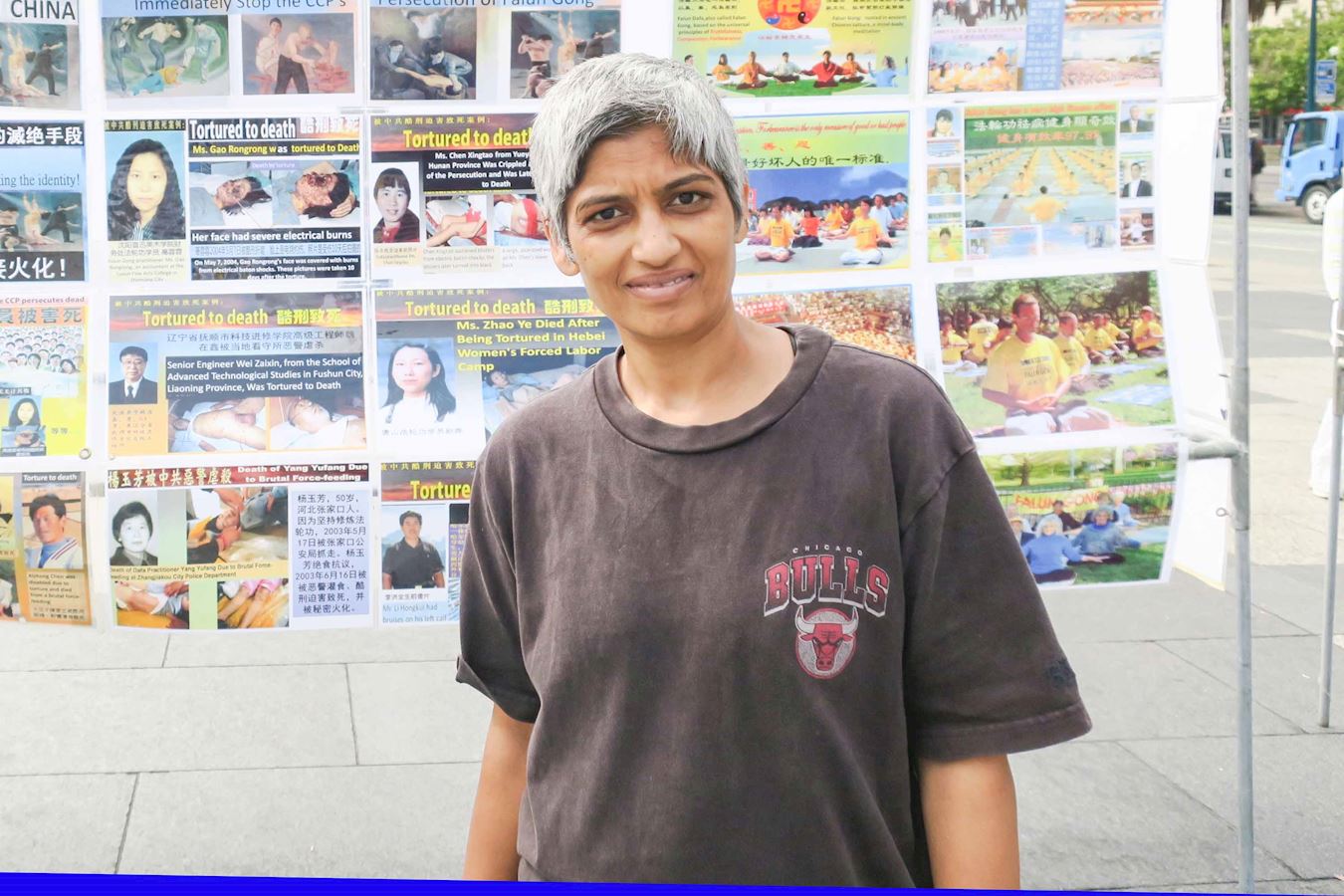 旧金山居民拉迪卡·乌达瓦利(Radhika Vundavalli)经过活动现场,在真相图片展前逗留许久。她对中共活摘法轮功学员器官非法贩卖的罪行感到愤慨。乌达瓦利表示,“怎么能如此卑鄙,这是反人类的行径,太不可思议了。法轮功学员只是在坚持自己的信仰,就遭受如此残酷的迫害,甚至被活摘器官。我们应该劝告那些去中国移植器官的人,不要去中国。”